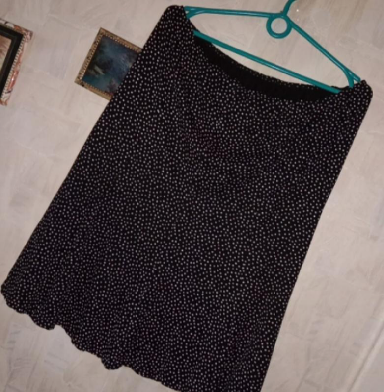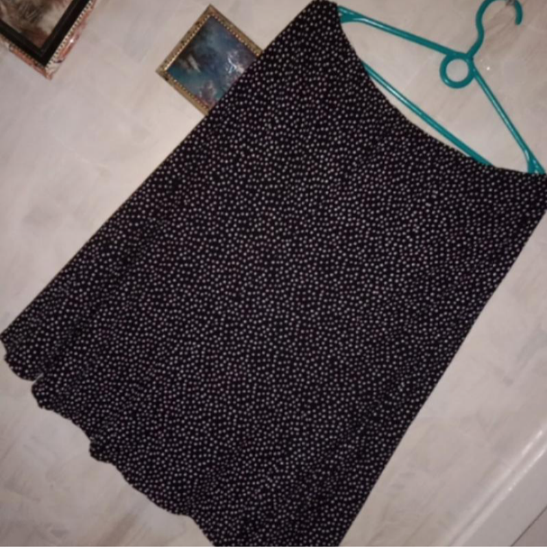 ПОТ 40+(до60)ПОБ 53+(до 60)ДОВЖИНА 62Чорна спідничка виробництва Франція у маленькі квадратики наче горох. Тягнеться, приємна до тіла, не мнеться.