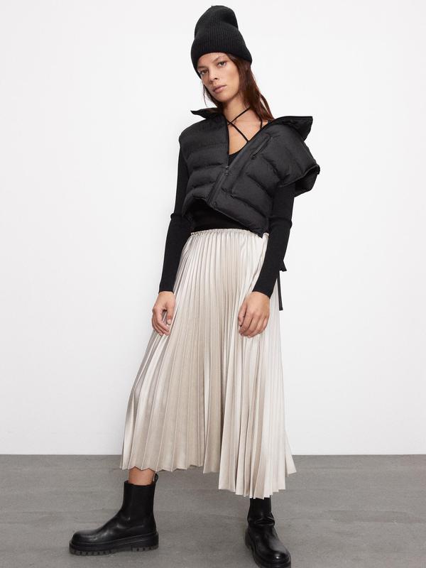 Трендова спідниця у складку від відомого бренду ZARA🖤 ✨На талії резиночка ✨Колір сріблястий ✨Є підкладка, яка коротша за основну до вжину Стан: ідеальний, як нова✅ Розмір: М Склад: 100% поліестер. Заміри: Талія (по чорній резиночці) - 35,5 + тягнеться 49 см Довжина спідниці по бічному шву - 83 см Довжина підкладку - 53 см Бедра - вільно Додаткові фото на запит, відповім на всі ваші запитання. Обов'язково дивіться інші мої оголошення⚠️ ‼️При покупці від 3-х одиниць, доставка безкоштовна‼️ Доставка будь-яким зручним для вас способом, передоплата 100 грн і післяплата або повна передоплата. Також ви завжди можете скористатися Безпечною оплатою❣️