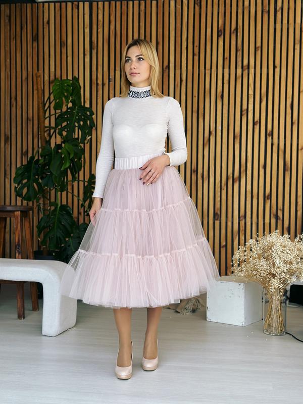 Унікальна спідниця з декількох шарів євросітки. Спідниця пишна жіноча. Євросетка мяхкая. Спідниця дуже повітряна та об'ємна. Виглядае дуже ошатний. Підійде для празника та для фотосесії. Спідниця на підкладці, зверхе резинка. Колір: пудровий Догляд: Рекомендується прати вручну при температурі не більше 30°C.