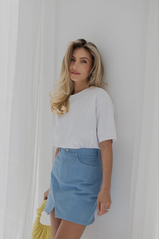Джинсова спідниця міні Нитка різні кольори Розмір:с<unk> м<unk> л.Склад: 100% бавовна Футболка так само у продажу