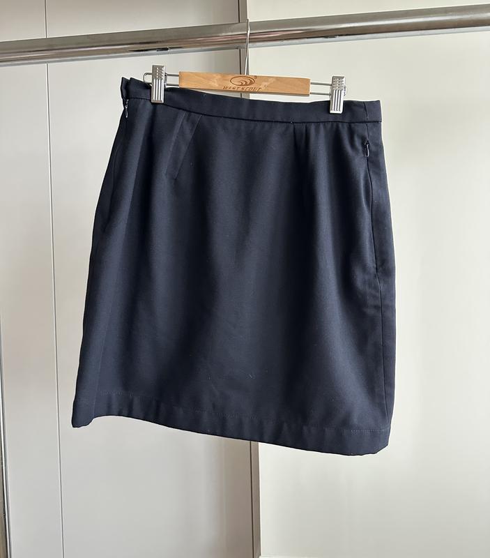 Темно-синя спідниця міні зі щільної тканини, розмір М (маленька Л)Збоку застібається від а потаємний замок, з іншого боку кишеня теж з прихованим замком Стан ідеальний, всі заміри на фото