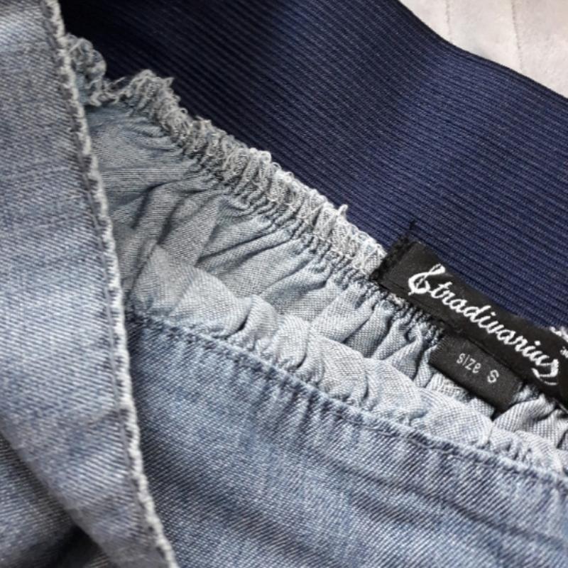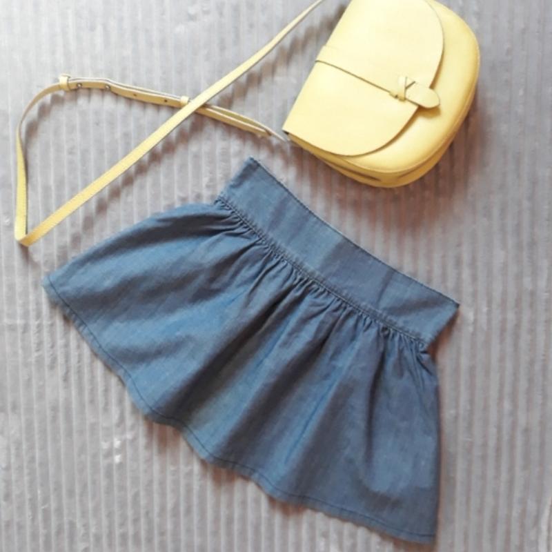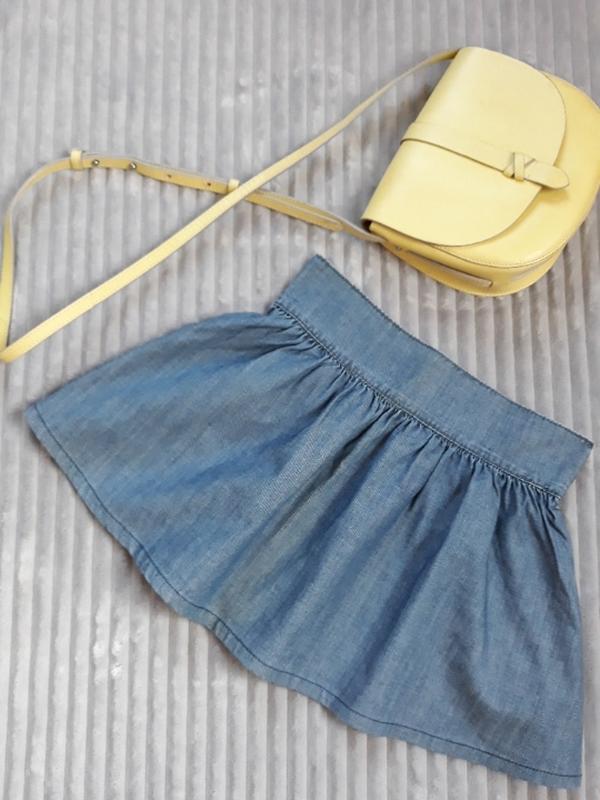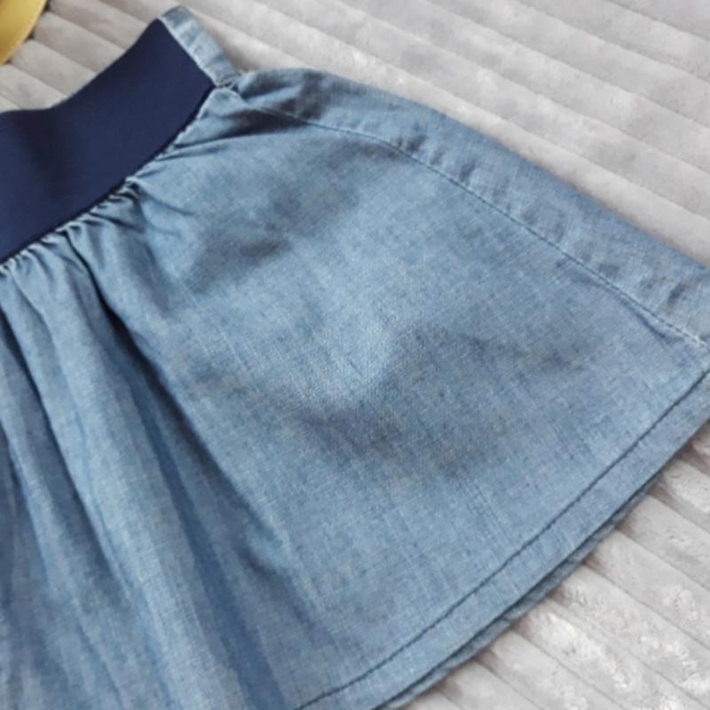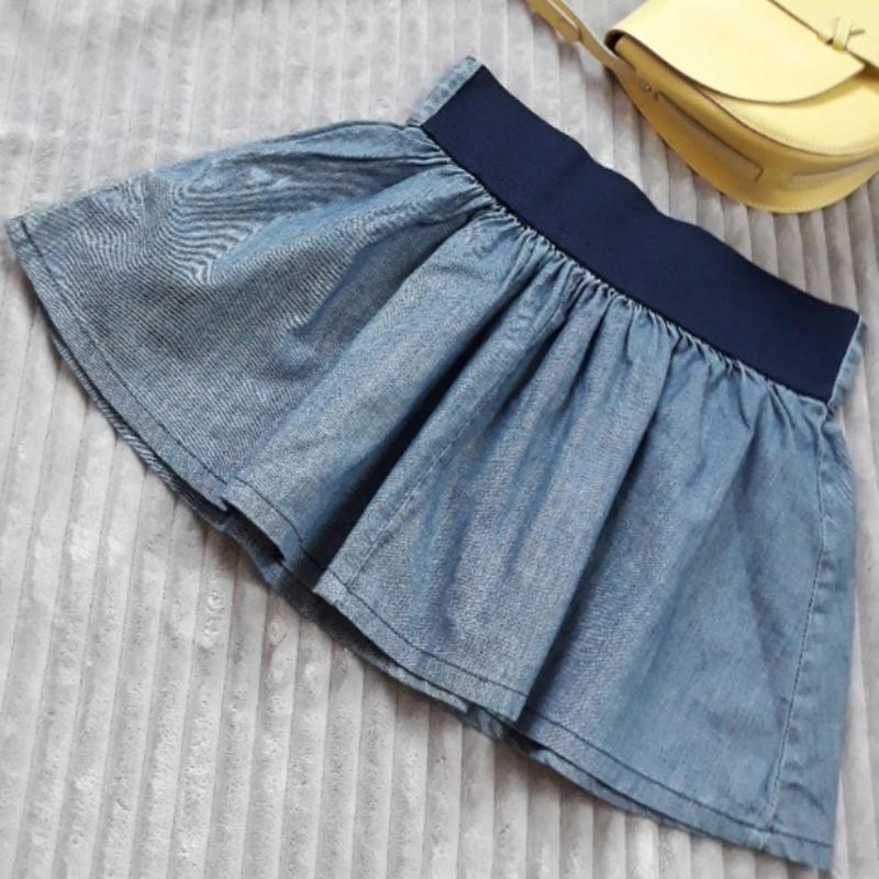 Спідничка з тонкого, річного джинса. У поясі широка гумка. Колір світло синій. Ширина в поясі 33см і тягнеться Довжина 33,5 см Висота поясу 7см Стан ідеальний без дефектів.
