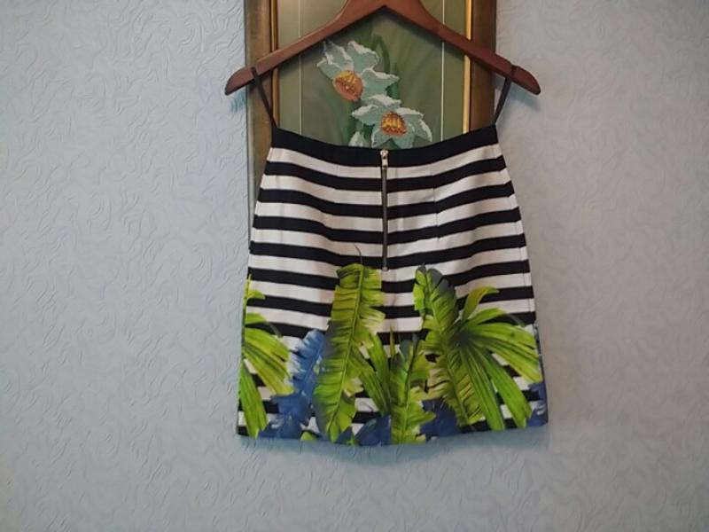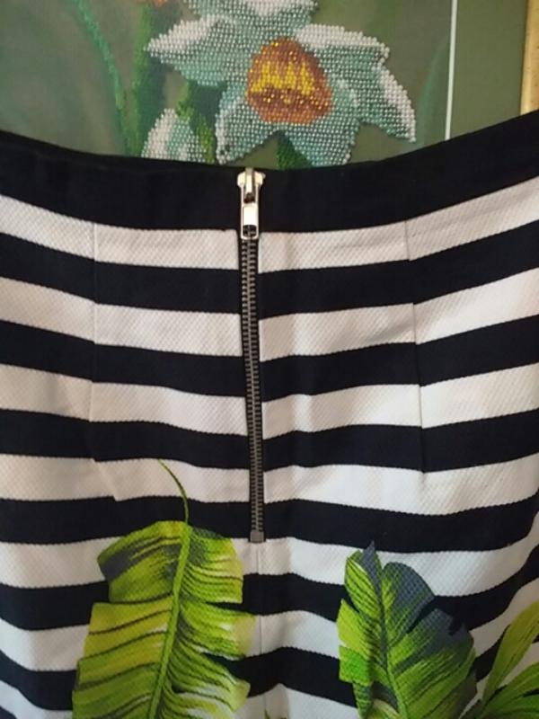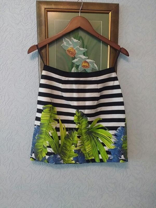 юбка в полоску с тропическим принтом хлопок эластан, размер 8( S), состояние хорошее, б/у, длина 42, ПОТ 31,5, ПОБ 46, ширина внизу 46,ткань плотная, фактурная,хлопок- эластан, ньюанс- небольшое пятнышко на последнем фото ( спереди , над полоской), цвет чуть менее яркий нежели на фото,состояние и ньюанс учтены в цене .