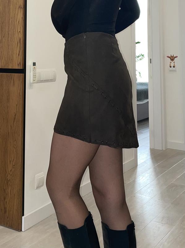 Дуже цікава спідниця,матеріал дуже схожий на замш. Перед трохи коротше, а ззаду довше. На стегна 93-95 ідеально
