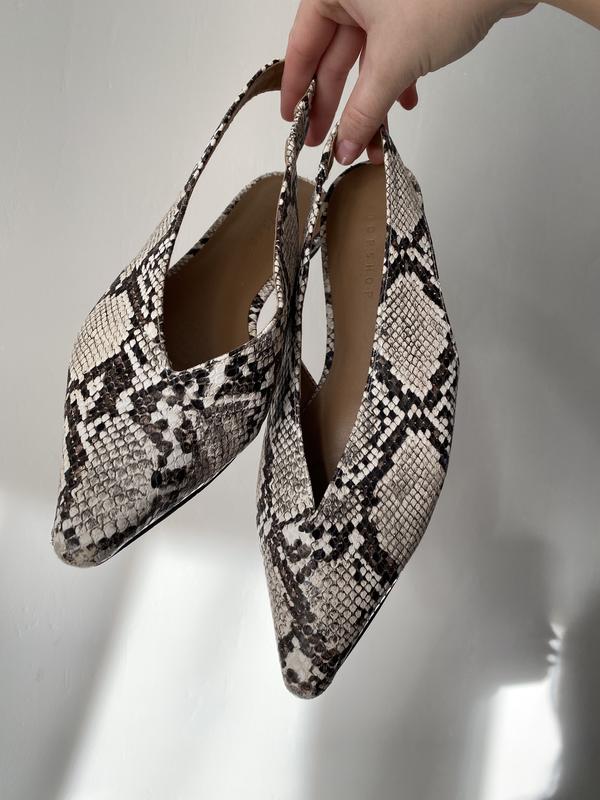Балетки з відкритою п'ятою в зміїний принт із гострим носком