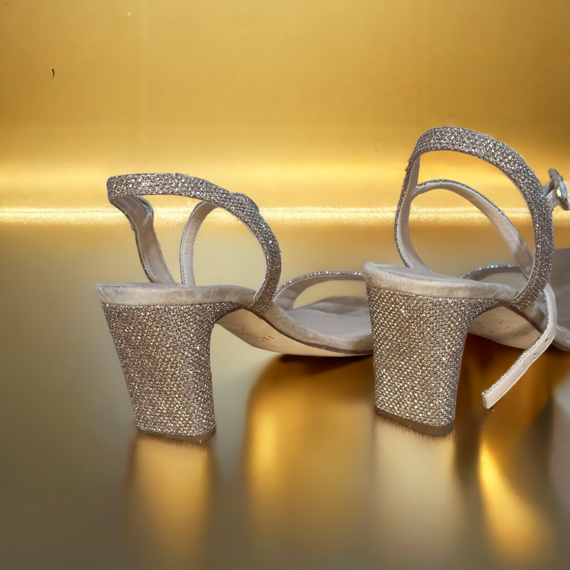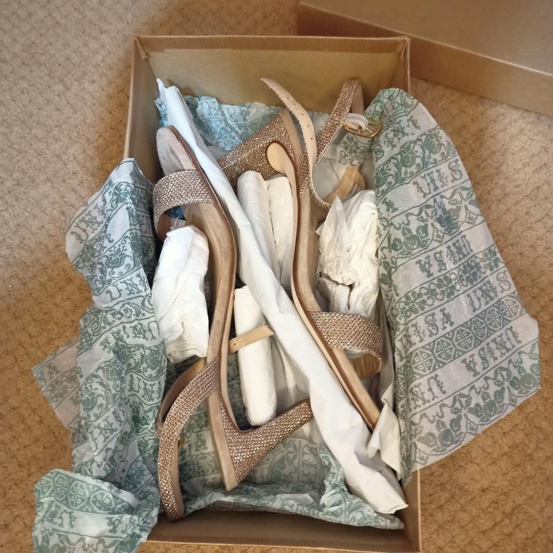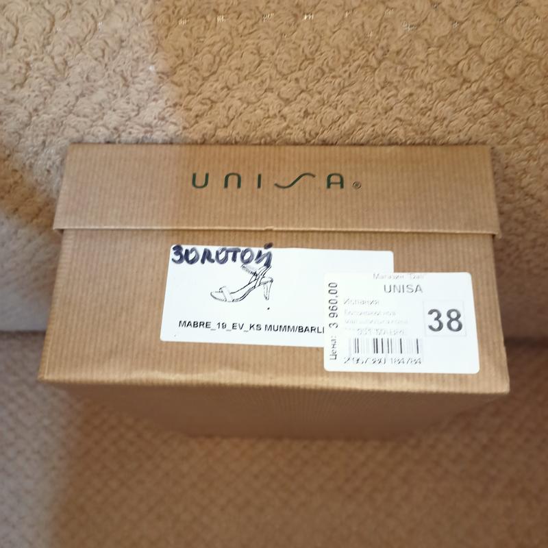 Босоніжки UNISA. Країна походження Іспанія.Розмір 38. Довжина устілки 25 см. висота каблука 7 см. Ширина перемички, де пальчики 8,5 см.Натуральна шкіра, замша, золоте вкраплення в замшу.Стан як нові. вділа один раз на банкет.