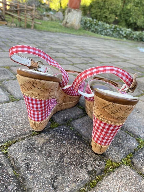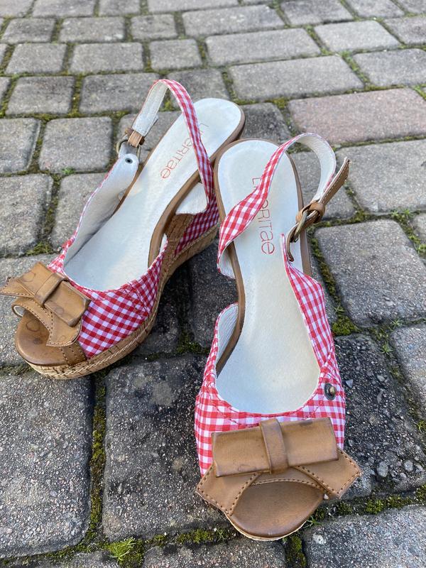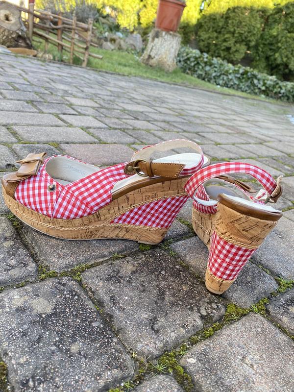 Босоніжки жіночі на танкетці. Легенькі, танкетка з корка. Середина шкіряна. Верх з тканини. Довжина по стельці :38 розмір - 24 см40 розмір -25,5 см