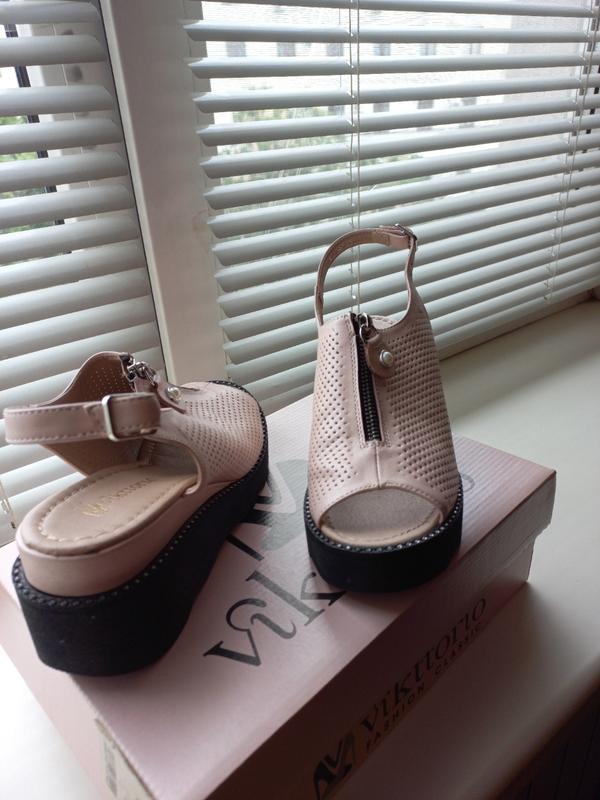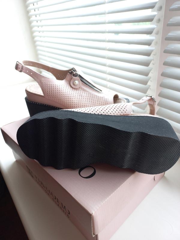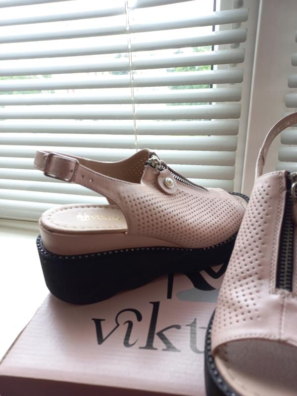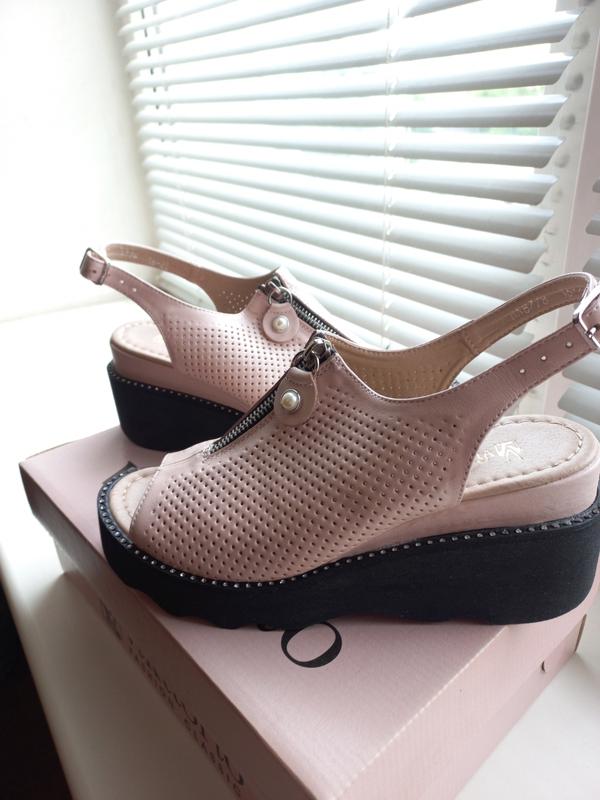 Новые кожаные босоножки..удобная устойчивая танкетка..посл.37 размер..по стельке -24 см..цвет бледно розово-бежевый..