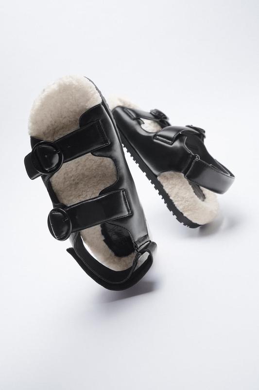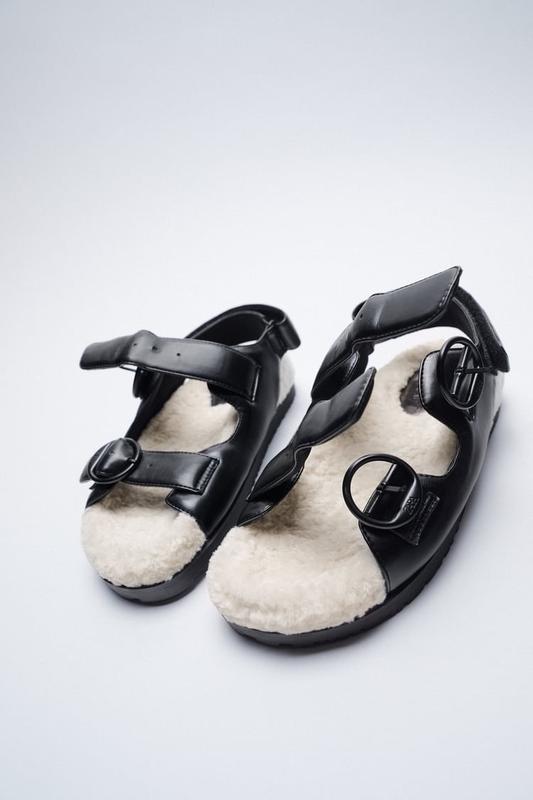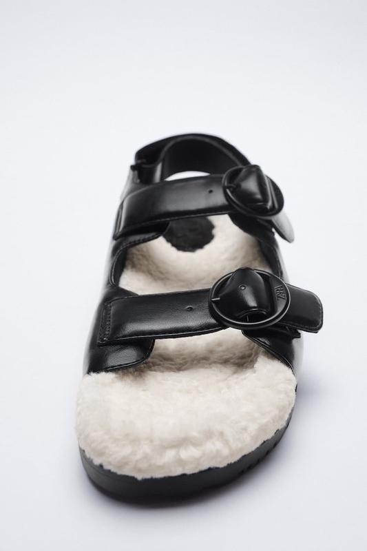 САНДАЛІ З ШТУЧНОГО ХУТРА Чорні сандалі на плоскій підошві. Ремінці з пряжками, підошва з штучним хутром. Застібка-липучка на щиколотці, рельєфна деталь на підошві.Стелька 26 см.