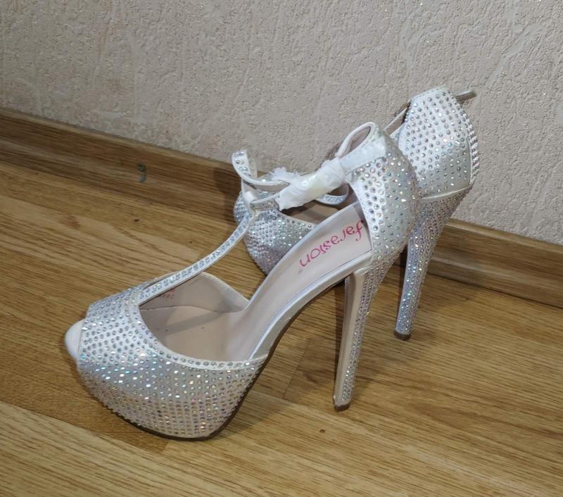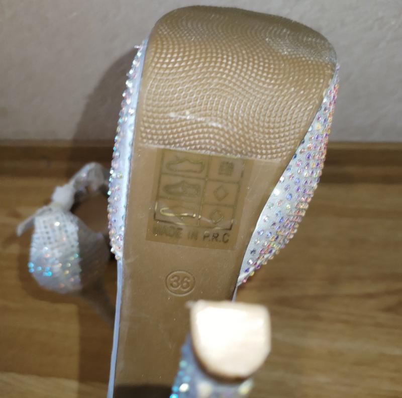 Босоніжки білі прикрашені стразами хамелеонами.Матеріал: текстиль.Розмір 36.Довжина по стельці 21 см.Висота платформи - 3 см.Висота каблука - 14 см.Нові, без недоліків.