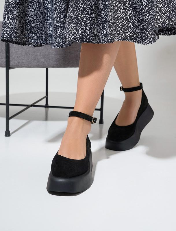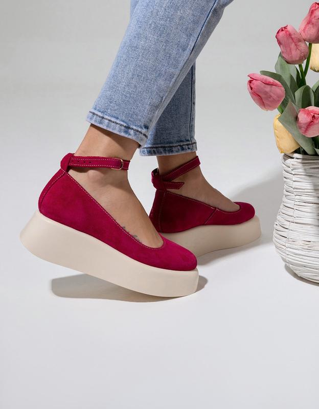 Рожеві замшеві босоніжки на високій платформі та регульованим ремінцем на щиколотці. Модель з об'ємною підошвою та внутрішнім шкіряним підкладом.