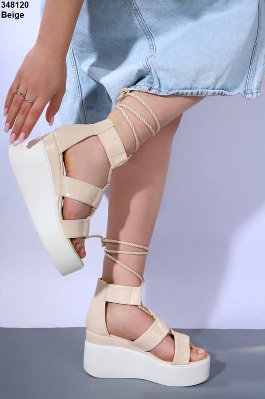 Стильні бежеві босоніжки/сандалі на завʼязках на товстій підошві жіночі літні,на літо