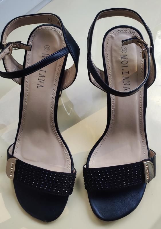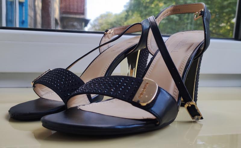 Босоніжки чорні з золотою фурнітурою на вихід Розмір 40.Одягалися лише раз на весілля подружки.Стан каблуку відмінний.Є лише нюанс з носочком та однією зі шлейок, де знаходиться імпровізований діамантик.Запакую в свою коробку