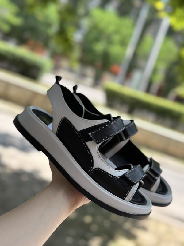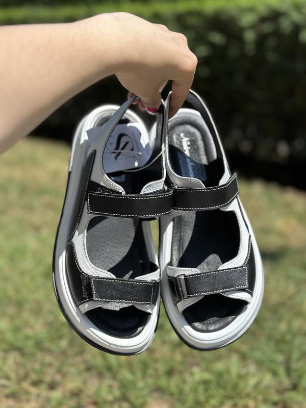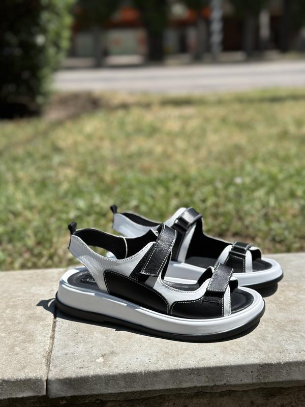 Трендові жіночі чорно-білі босоніжки з натуральної шкіри/ шкіряні чорні босоніжки/ жіночі білі босоніжки