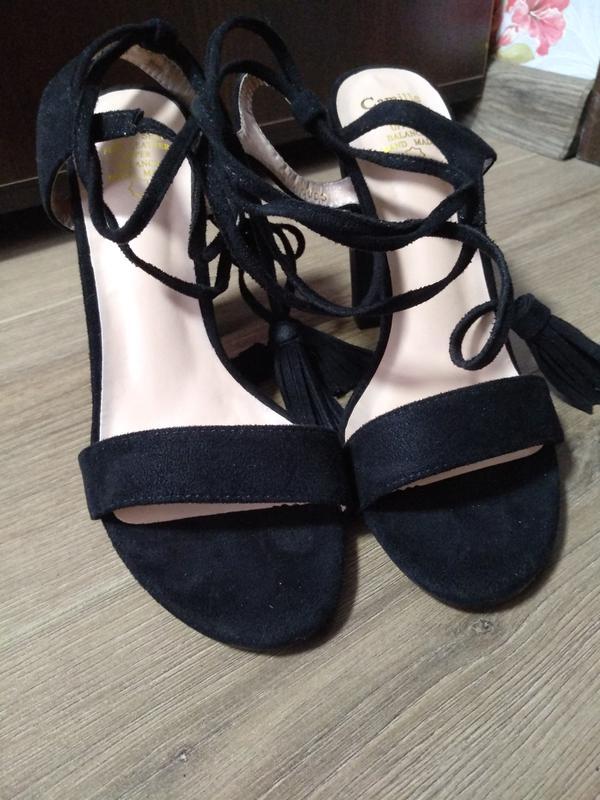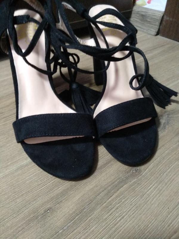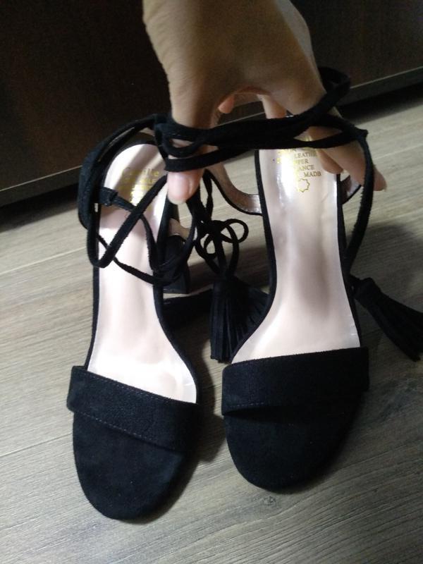 Чорні жіночі босоніжки на завязках під замш на каблуці
