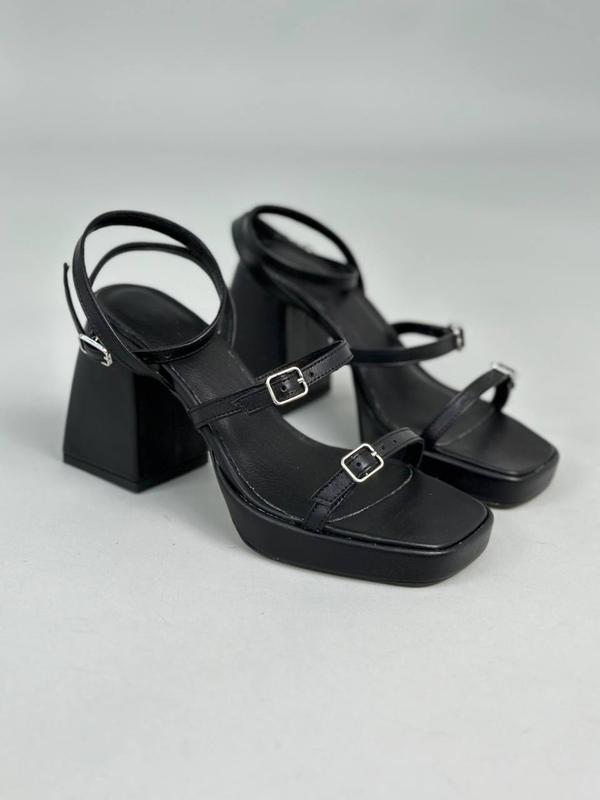 Жіночі чорні босоніжки на стійкому підборі заввишки 8.5 см із натуральноїшкіри. Ця модель також є в білому кольорі.
