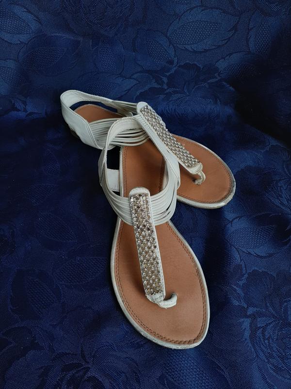 Оригінальні літні, дуже легкі відкриті босоніжки, - сандалі на плоскій підошві - "римлянки". Якісна пресскожа, щільна лита підошва. Декоровані планкою з металевими стразами. Практичні, зручні, доповнять будь гардероб! Стан хороший, без дефектів.