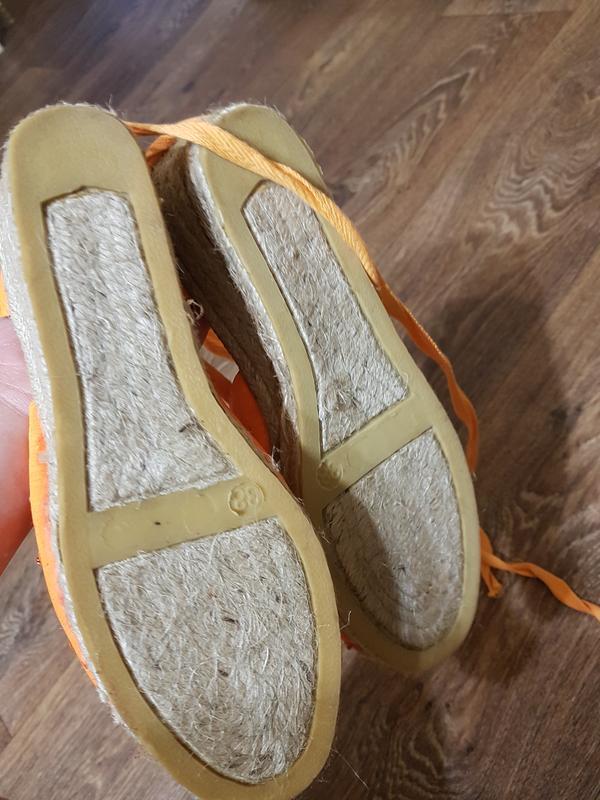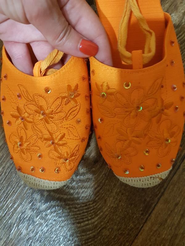 Оригінальні іспанські еспадрільї на танкетці, виконані повністю з натуральних матеріалів. Насичений яскраво-оранжевий колір. Вказаний 38 розмір, але фактично йдуть на 38.5. Довжина устілки 25 див. Йдуть на ногу нормальної, середньої повноти. Верх прикрашений витонченою вишивкою, бісером і паєтками, невисока, дуже зручна танкетка. Підошва з натурального джуту, носок прошитий. Нові, у використанні не були. Висота танкетки 6,2 см, платформа 1.5 див.