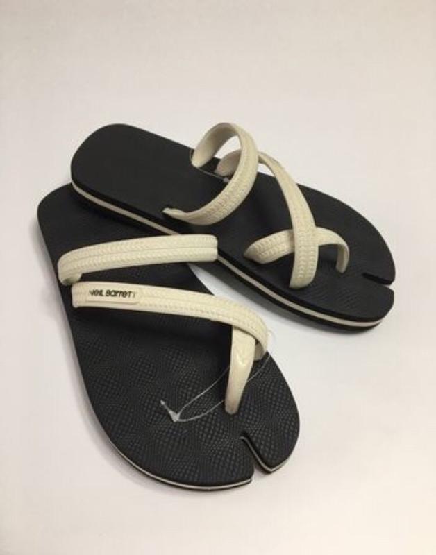 Оригінальні нові в'єтнамки від англійського модельєра Якісна марка Розмір 36/37 ( 24 см), висота 2 см Взуття абсолютно нова, є наклейки і рідні кріплення бирок Колір - чорний і білий Спереду на лямках є акуратний візерунок і назва бренду Взуття дуже легка, відмінно фіксує стопу, гума досить товста Спереду носок закруглений, є виріз під великий палець Є пильник цієї ж фірми для зручного зберігання взуття