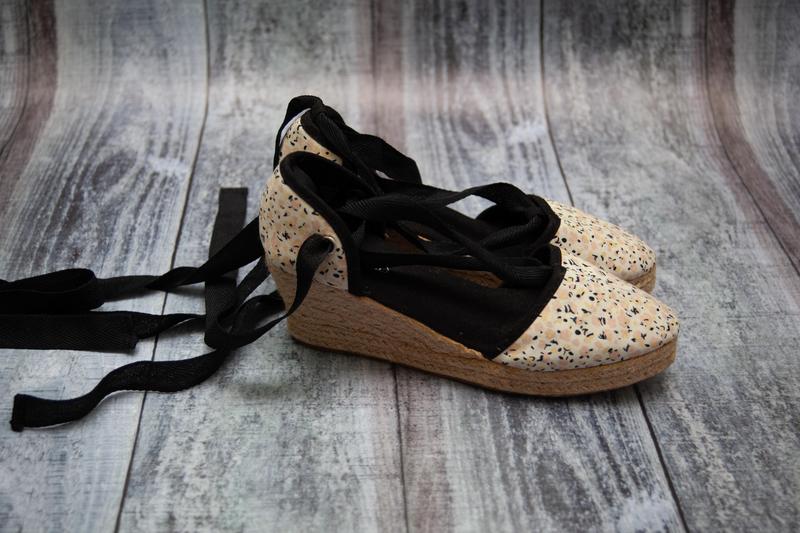 Босоніжки тканинні із закритим носком і плетіннями, стан хороший, по устілці 24,5 см, висота танкетки спереду на 2 см, ззаду 7 див. На правому босоніжці потрібен ремонт петельки (підшити)