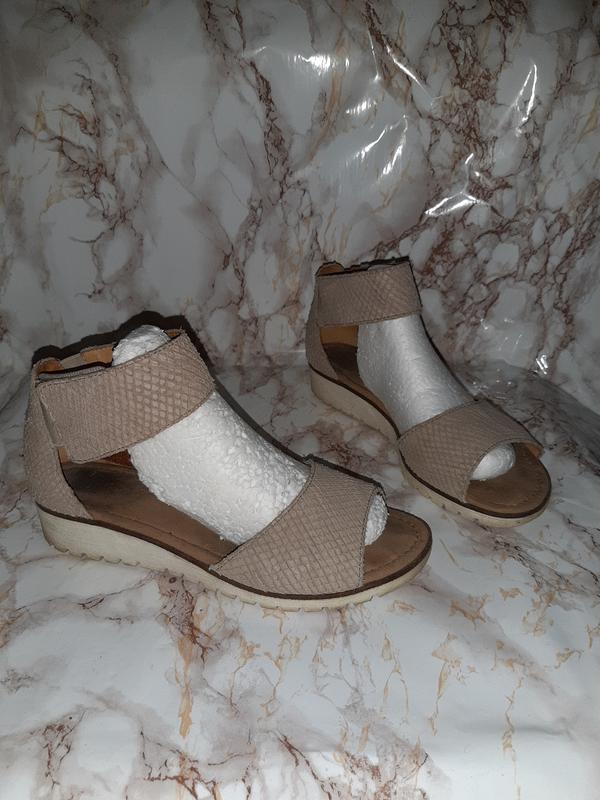 Пудрові рожеві шкіряні босоніжки на низькому ходу, із закритою п'ятою, на липучках. Розмір 37.5, по устілц і-24,2 див. Красиві, зручні. Є сліди шкарпетки на лівої п'ятки, з внутрішньої сторони босоніжка(цятки).