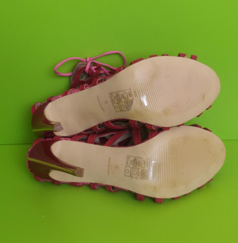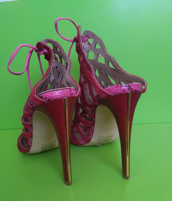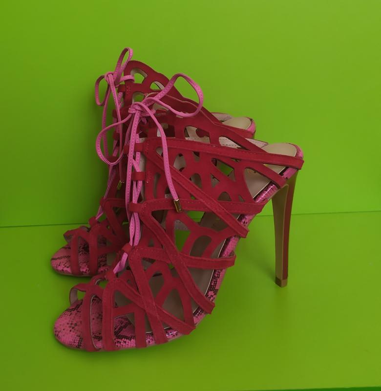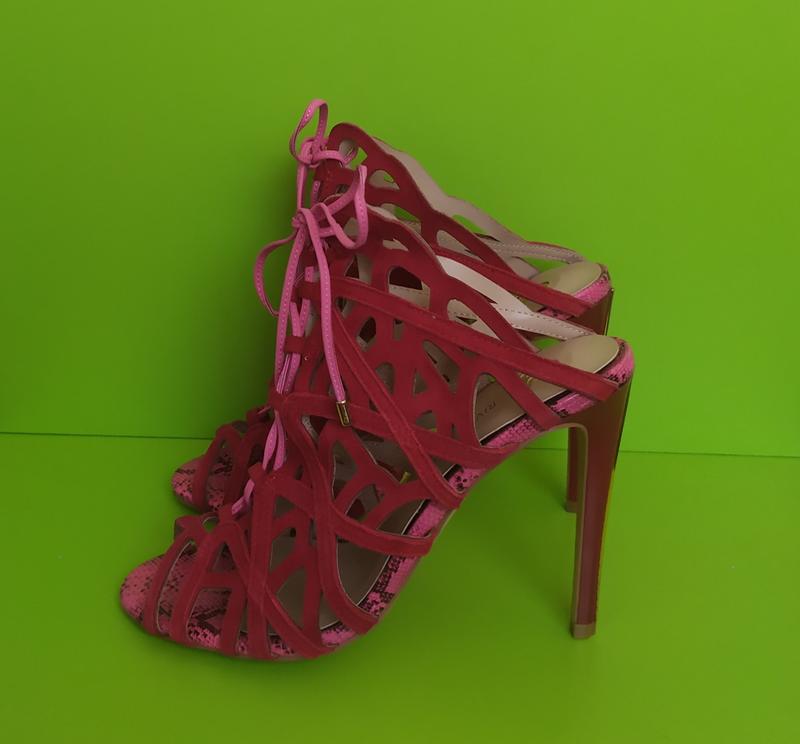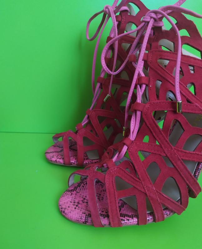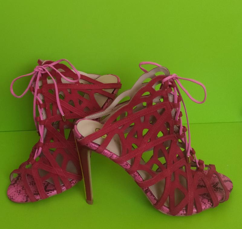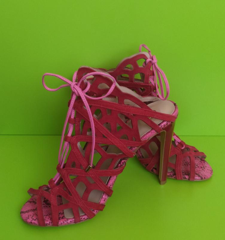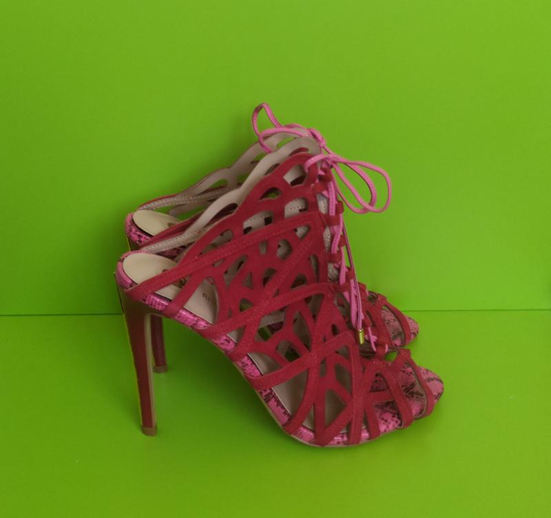 Босоніжки малинові ажурні на зав'язках, 6/39, устілка 24,8 см, ширина 7,5 см, каблук 12 см