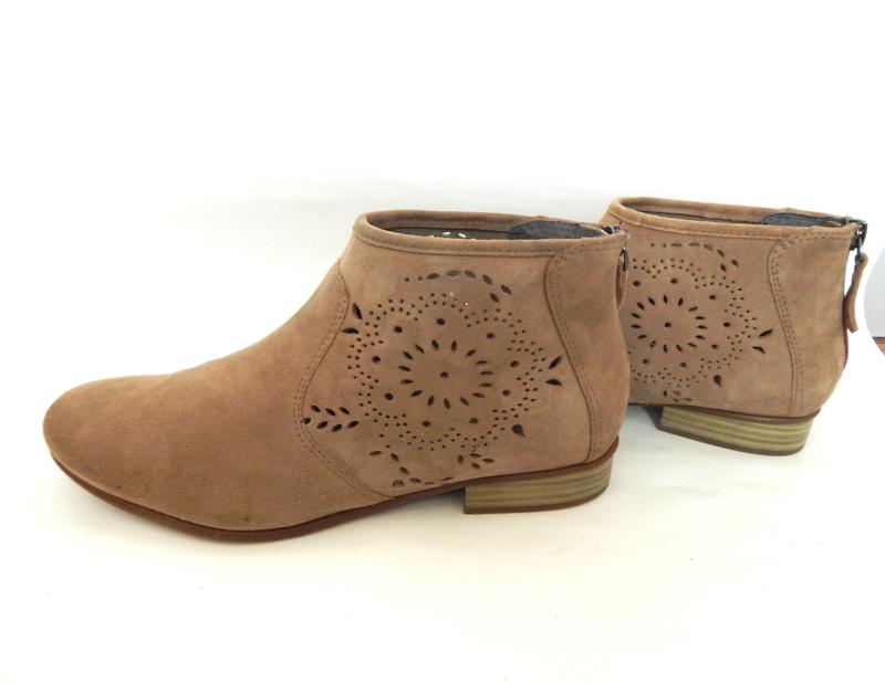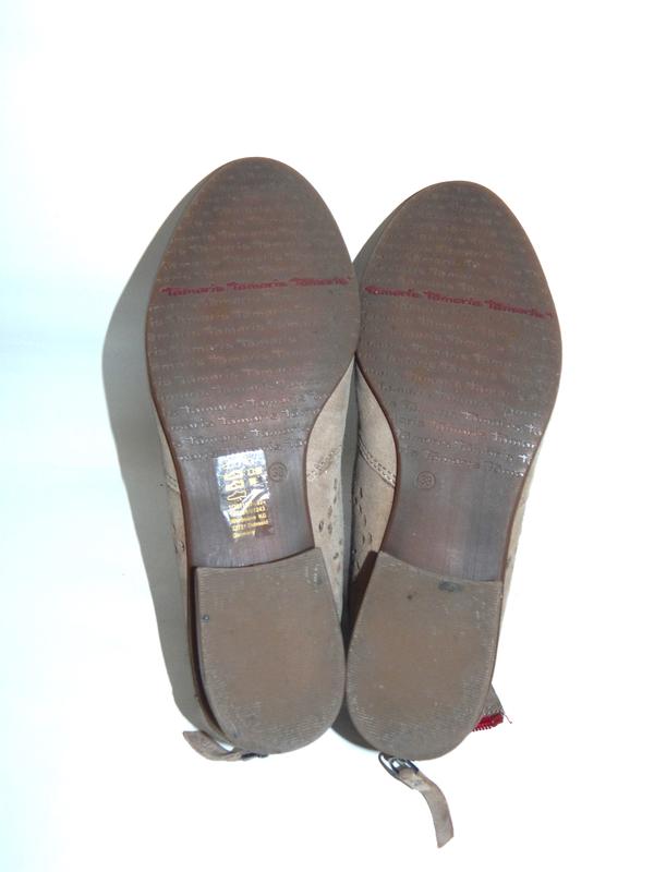 Ботинки з перфорованої замші, ззаді змійка. Легенькі. Подошва гибкая. Гарного кольору. Висота 9,5см, стелька 25 см, каблук 2,5см. Нюанс на фото