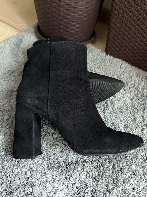 Майже нові, взуті декілька разів на свята ( по каблуку та підошві видно). Натуральна замша, всередині шкіра, устілка утеплена. По устілці 25 см, висота каблука 9,5 см.