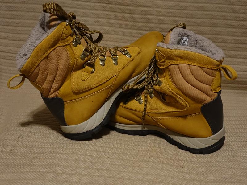 Продукцію бренда вирізняє дивовижний комфорт, практичність, якість і стовідсотково робочі функції. Компанія у виробництві використовує інноваційні технології, чимало з яких розроблена безпосередньо фахівцями бренда: безшовна технологія кріплення підошви, силіконове просочення матеріалу, лита поліуретанова устілка «Anti-Fatigue», мембрана «Gore-Tex», амортизований каблук, міцна та зносостійка каучукова підошва «GripstickTM», тришарова підошва «SensorFlexTM», система клімат-контролю «ClimapathTM», підошва «L7 traction lug», технологія «SmartWool», що підвищує амортизацію технологія «Crash Blaster», водо- і брудостійка технологія «Splash Blaster», технологія «Sanitized». Також компанія, екорієнтована, використовує у виробництві перероблені ПЕТ і каучук, унаслідок чого були отримані екологічний матеріал «CORDURA®», компонент «Green RubberTM», матеріал «ReCanvasTM» і біогума «BIO-BASED RUBBER». Все взуття проходить спеціальні перевірки та тестування. Не менш серйозно та вимогливо компанія підходить до вибору матеріалів — це тільки якісна шкіра та нубук, натуральні (льон, бавовна, вовна), штучні (овчина «SmartWool Faux Shearling») і змішані сучасні тканини. Основний відсоток виробів виготовляється в країнах Азії, але серед виробників можна зустріти й США, англійську, Німеччину, Австрію, Іспанію чи Італію. Продаються чудові високі зимові шкіряні черевики знаменитого американського мультибренда Timberland. Верх виробу виготовлений із комбінованих матеріалів: товстий натуральний нубук кольору куркуми, товста оксамитова натуральна замша кольору куркуми. А дуже м'який об'ємний язичок і об'ємна, як-от стьобана вставка у верхній частині задника — м'яка кордура в тон шкіри. У нижній частині задника — фігурна вставка з натуральної шкіри кольору гіркого шоколаду. Шкіра із захисним поліуретановим покриттям, захист від води та бруду. У верхній частині задника — велика петля, виготовлена з натурального нубуку кольору куркуми. У нижній частині зовнішньої бічної поверхні тисненням на шкірі зображений логотип бренда. Модель фіксується на нозі за допомогою м'яких широких плоских чорно-жовтих шнурків, які протягуються через 7 пар обертових металевих півкілець різної величини. У верхній частині дуже об'ємного тканинного язичка пришитий фірмовий тканий лейб бренда. Виворітна сторона черевиків м'яку теплу флісову підкладку кольору куркуми. По верхньому краю проходить 6 см. вставка з м'якого штучного хутра бежевого кольору. Між підкладкою та шкіряним верхом виробу є фірмовий утеплювач PrimaLoft — це синтетичний матеріал, який має високі теплоізоляційні властивості. Під час його створення компанія дуже скрупульозно вивчив структуру гусячого пуху та вклала її в основу матеріалу PrimaLoft. Волокна цього утеплювача дуже тонкі та схожі на гусячий пух більше, ніж волокна будь-якого іншого синтетичного матеріалу. Саме ця схожість надає йому теплових властивостей пуху. Коефіцієнт термічного опору для гусячого пуху становить 2.18, а PrimaLoft — 2.15. Це дуже високий показник, оскільки інші синтетичні волокна навіть не наближаються до цієї величини. Устілка фірмова м'яка ткана знімна. Устілка фірмова — Timberland Earthkeepers anti-fatigue. Підошва складається з легкої амортизаційної міжпідошви світло-сірого кольору. Основна підошва — фірмова підошва бренда. Виконана з високоякісної зносостійкої рифленої гуми з якісним протектором. Черевики в відмінному стані. 