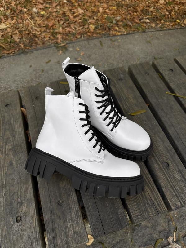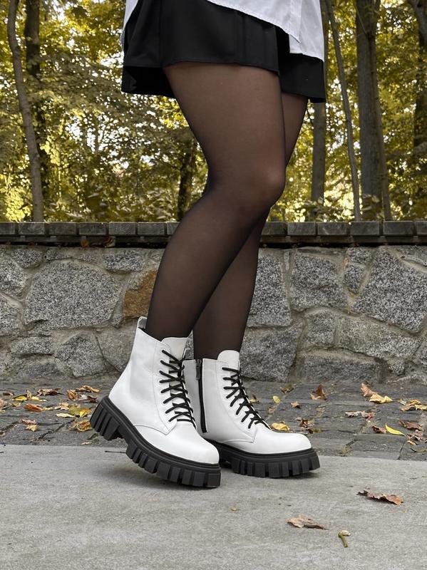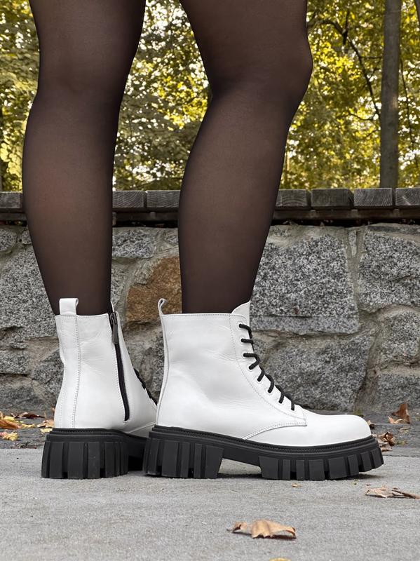 Стильні трендові демісезонні жіночі черевики берці білі шкіряні на грубій тракторній підошві,осінні