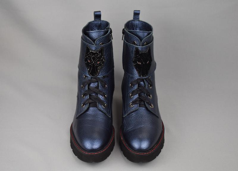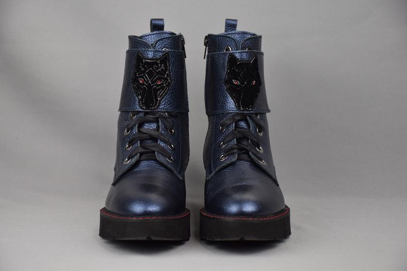 Якісні та зручні сині жіночі черевики виконані з високоякісної м'якої еластичної натуральної шкіри з оксамитовою вишитою аплікацією голови чорного вовка.
