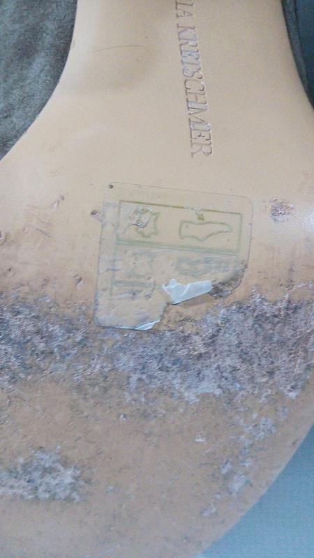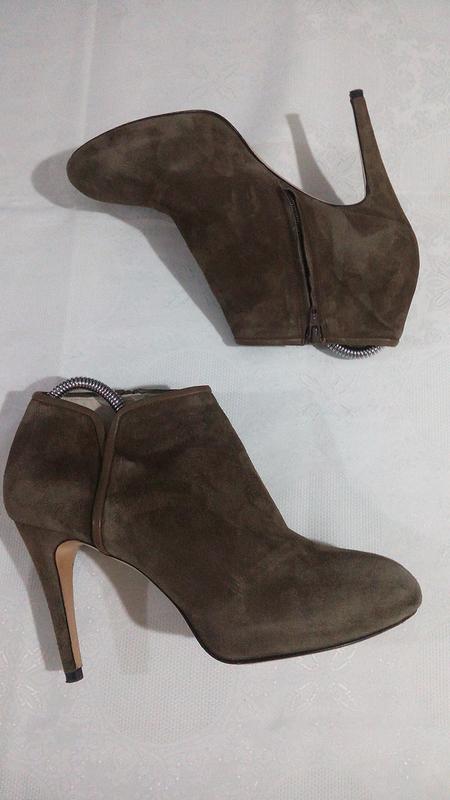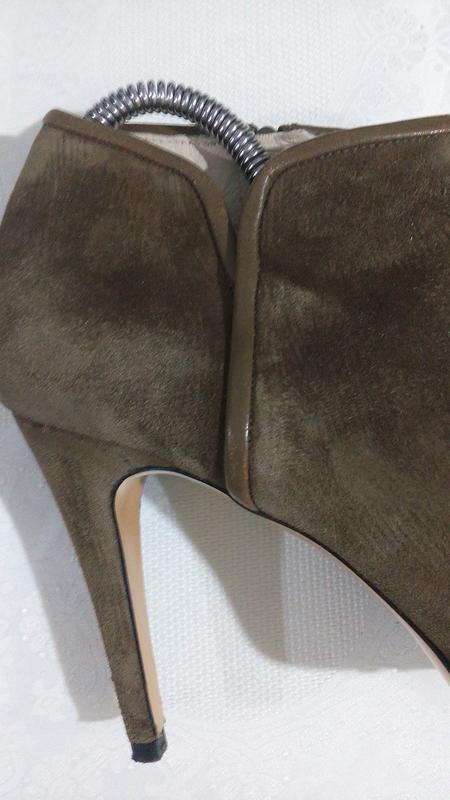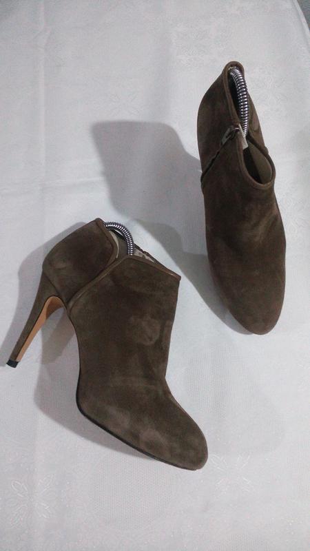 Сліди носіння тільки на підошві,замша бархатиста,всередині ,теж шкіра,чисті,чистенькі,ніби й не носилися. Устілка-26,5 Каблук-10(10,5) Є скрита платформа(2 см),що робить їх устойчивими і зручними. Висота-8,5(9)- без каблука,і -19( з каблуком) Розмір вказано 40.Колір кава з молоком.