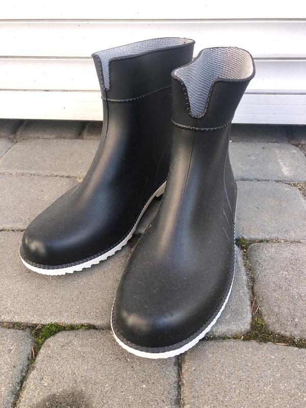 Жіночі гумові чобітки. Хорошої якості. Цікавий дизайн. Чобітки чорного кольору на білій підошві. Цей контраст робить ці чобітки стильними.