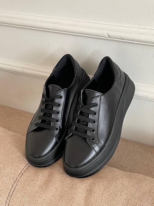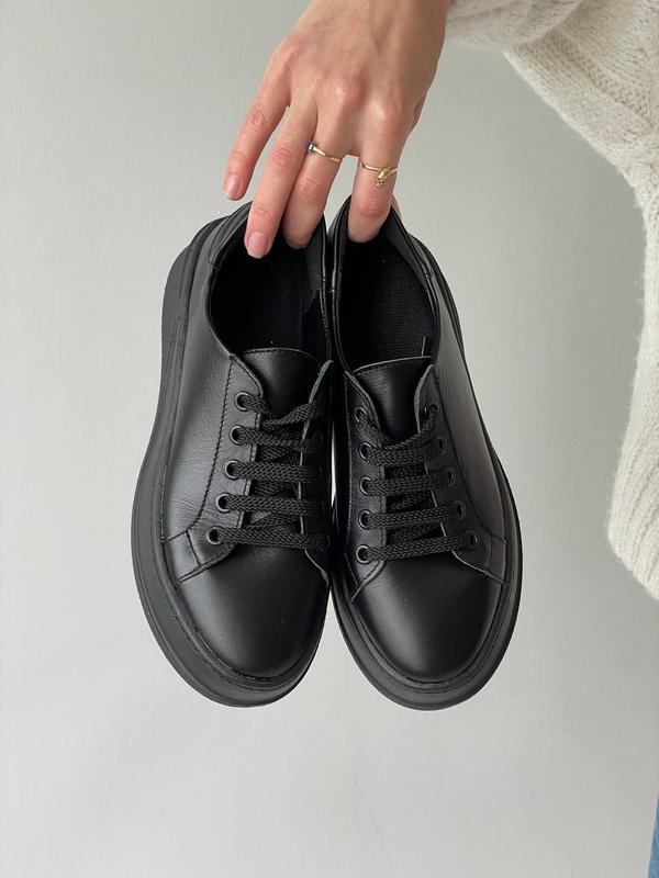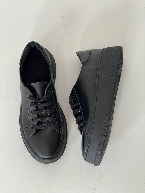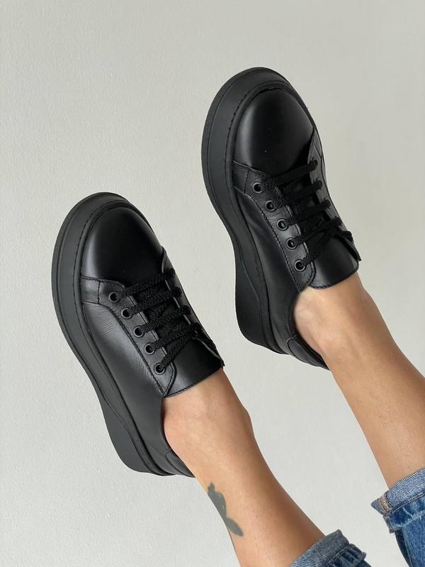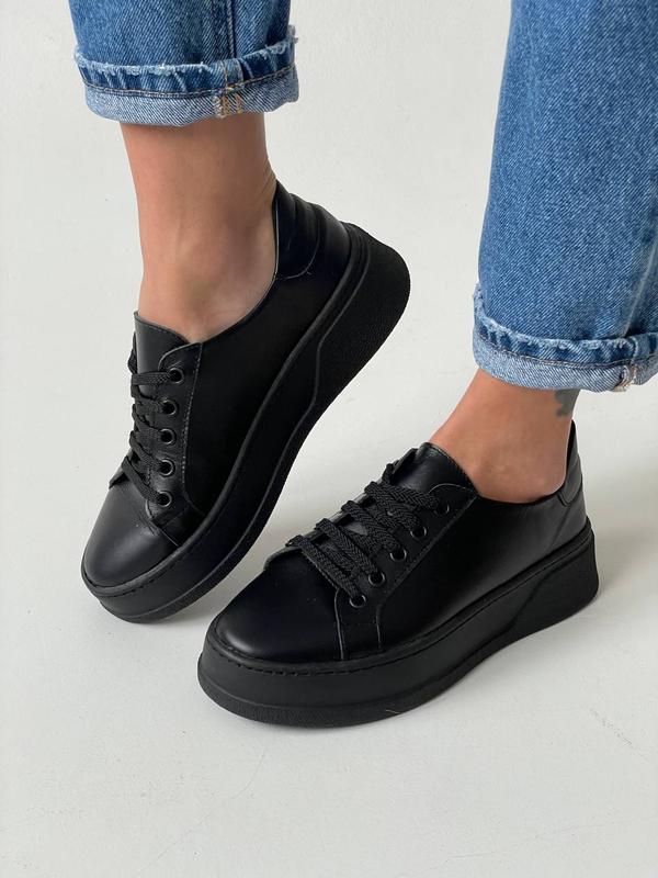 Чорні шкіряні кеди на шнурівку на чорній підошві, прошиті Висота: 4 см ( до п'ятки ) виробництво Україна Платформа: 3-4 см На середню ніжку Розмір в розмір Розмірна сітка: 36 - 23,5 см 37 - 24 см 38 - 24,5 см 39 - 25,5 см 40 - 26 см