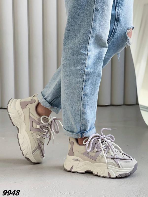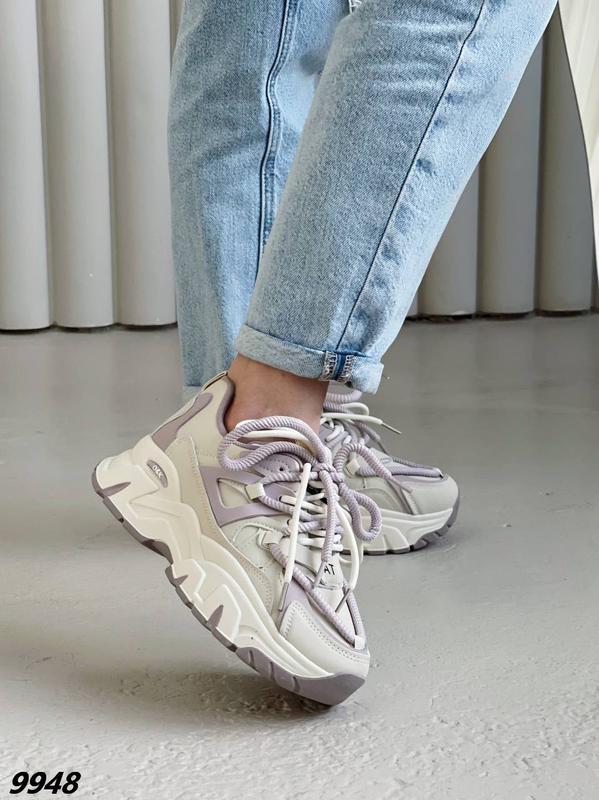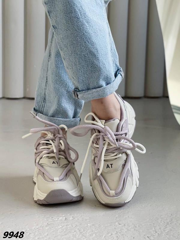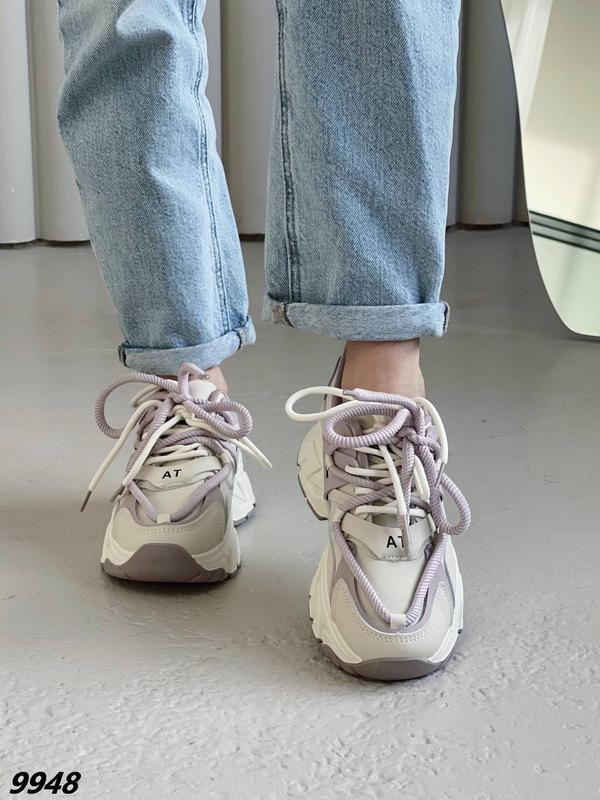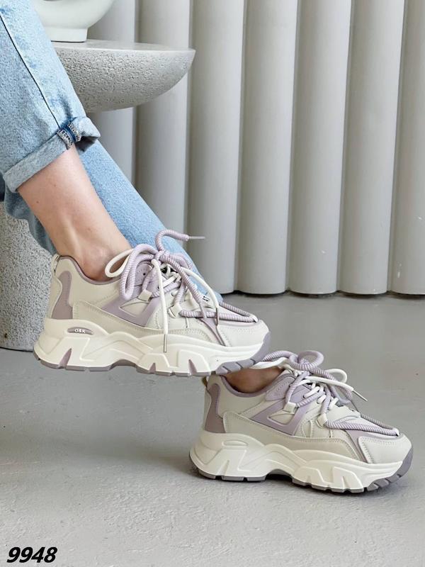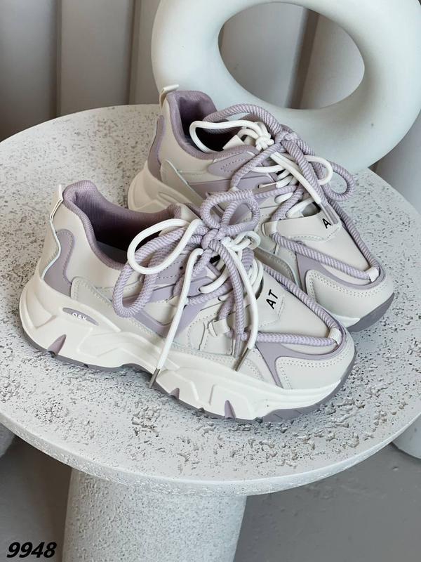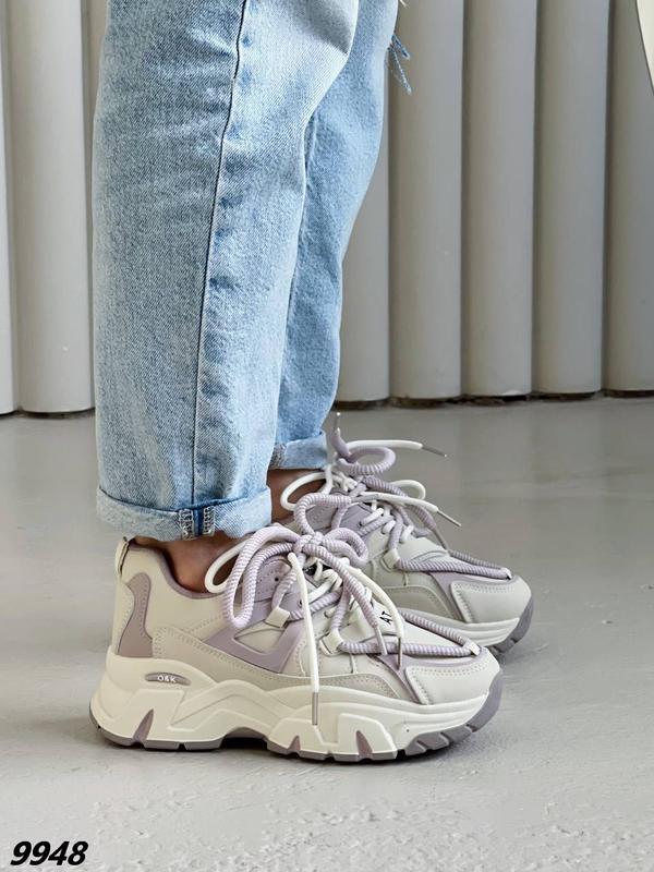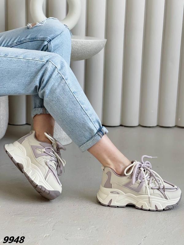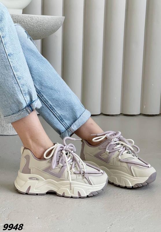 Кросівки Матеріал еко шкіра Колір беж з бузковими вставками На шнурівці Висота від п'яти 6,5 см Висота підошви позаду 5 см , попереду 3 см