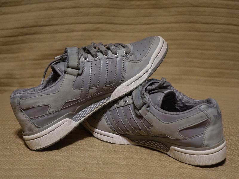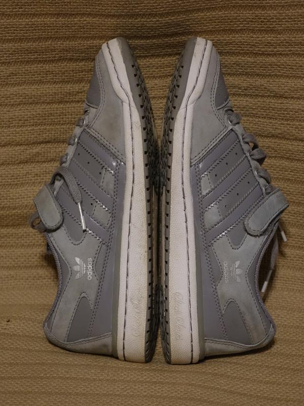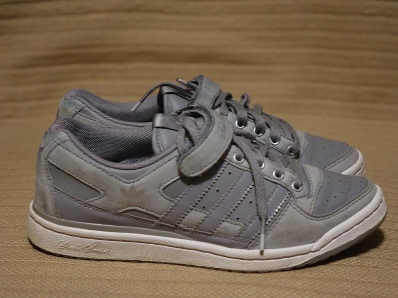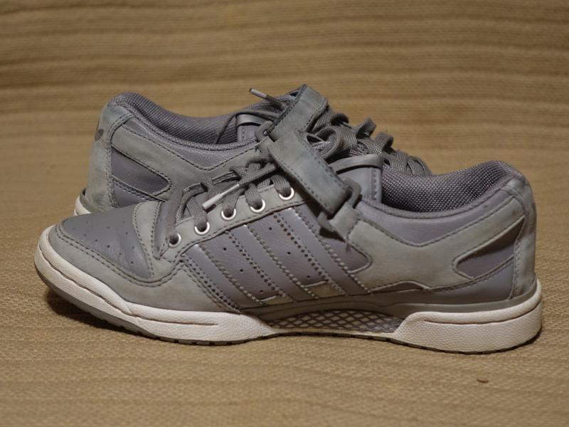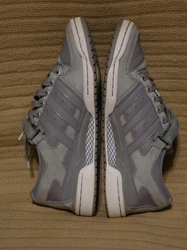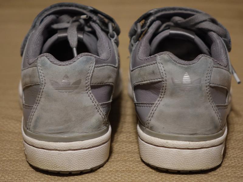 Верх изделия выполнен из комбинированных видов натуральной кожи: мягкая гладкая натуральная кожа стального цвета и мягкий натуральный нубук серого цвета. Традиционно модель перфорирована в области чуть сужающегося мыса, а также в передней части боковых поверхностей. Характерные 3 параллельных полоски выполнены из лакированной кожи серого цвета. Модель фиксируется на ноге при помощи плоских мягких шнурков серого цвета, которые продеваются через 6 пар люверсов. А в верхней части предусмотрен регулируемый кожаный ремешок. Он крепится на наружной боковой поверхности изделия при помощи надежной липучки. На кожаном ремешке представлена фирменная маркировка бренда. А на наружной боковой поверхности изображен логотип бренда.