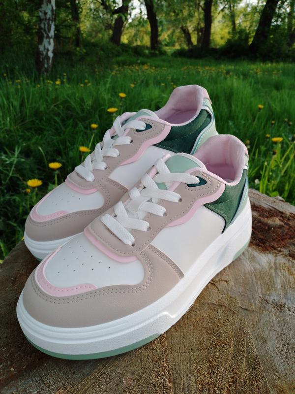 Бежеві кросівки з різнокольоровими вставками. Традиційна шнурівка, висока підошва, круглий носок. Нові, нажаль не підійшли за розміром. Матеріали: 100% поліуретан, 100% поліестр. Розмір: 37 (більшомірить на 38) Висота підошви: спереду 3см., позаду 5 см.
