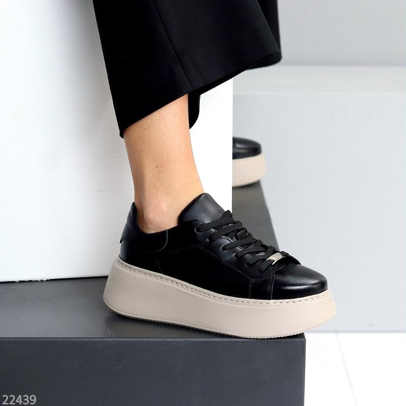 Натуральні шкіряні чорні кеди - кросівки на високій бежевій підошві