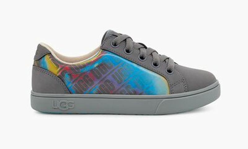 Сетка для язычка из парусины, изготовленная из 100% переработанных полиэфирных волокон, металлические люверсы, радужный двояковыпуклый ТПУ с повторяющимися деталями логотипа UGG.