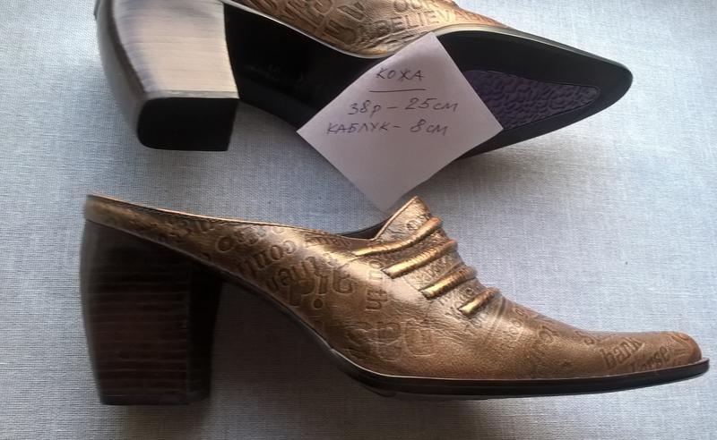 Шкіряні сабо *козаки*, зручна колодка, стійкий каблук 8 см, довжина устілки 25 див. Коричневий колір з бронзовим відливом