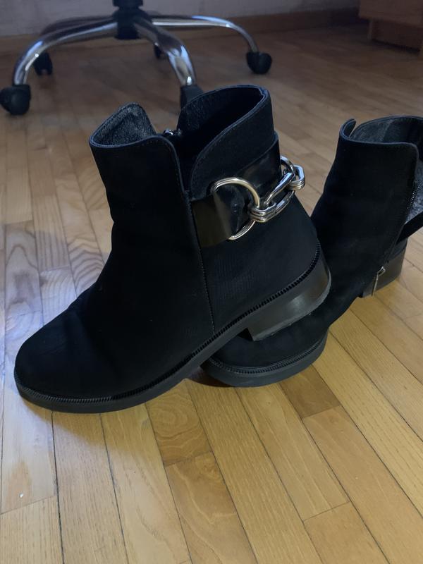 Нубук, є елементи від носіння( згини зверху, але невиразні), підошва ціла. Устілка виймається- майже 25 см. Всередині штучне хутро. Дуже теплі і практично. Не слизькі. Каблук 3 см, підошва 1 см. Ціна договірна