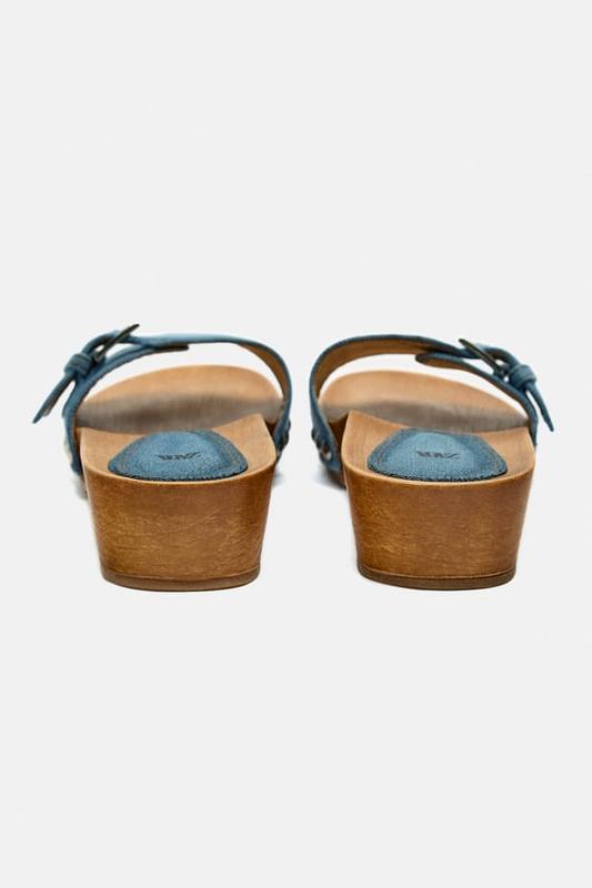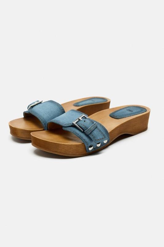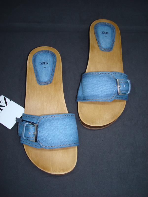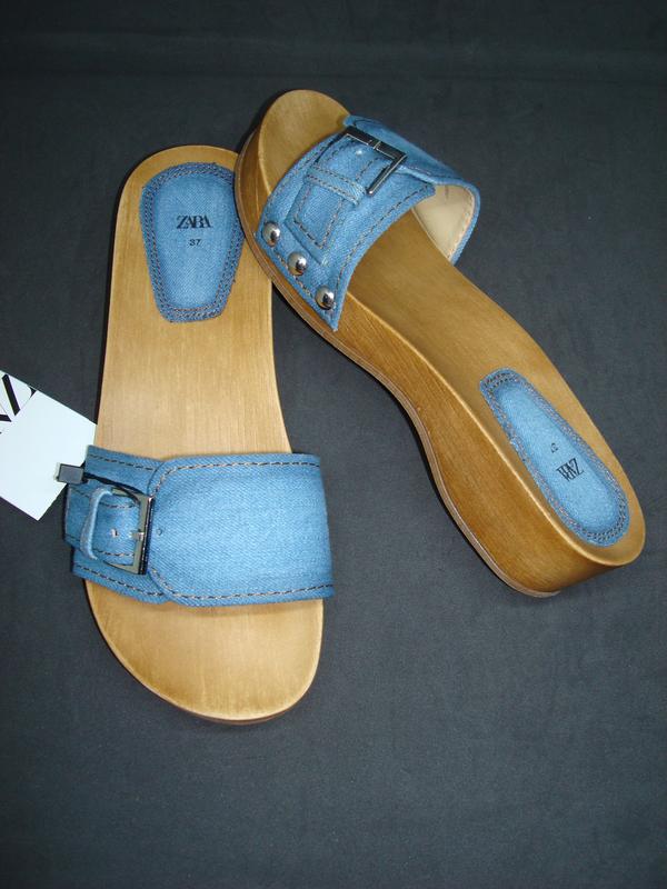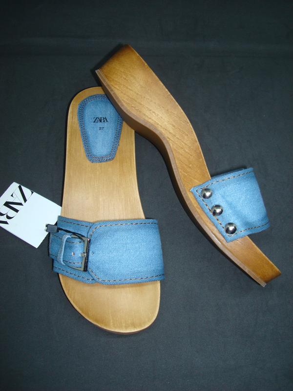 Стильные женские шлепанцы на танкетке от известного испанского бренда Zara. Легкие и удобные! Модный джинс! Актуальная модель сабо. Мягкая пятка. Отличное качество! Состав: текстиль, подошва - дерево. Высота танкетки - 3,5 см.