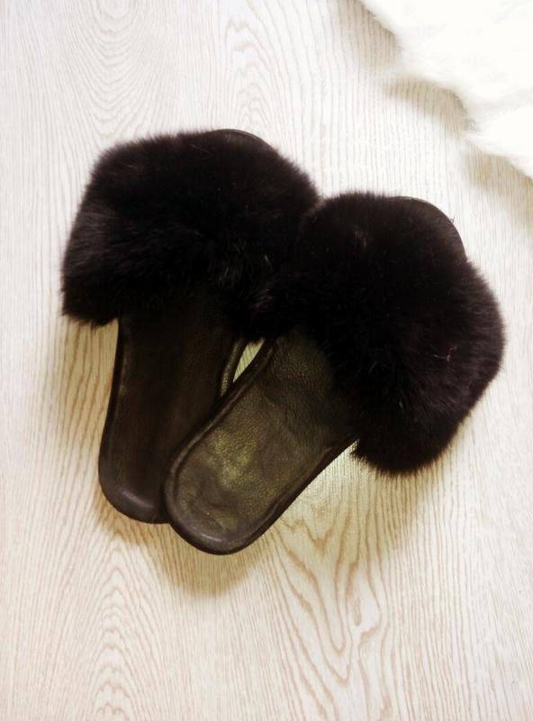 Чорні повністю натуральні шльопанці з хутром шкіра і кролик ангора сандалі шкіряні