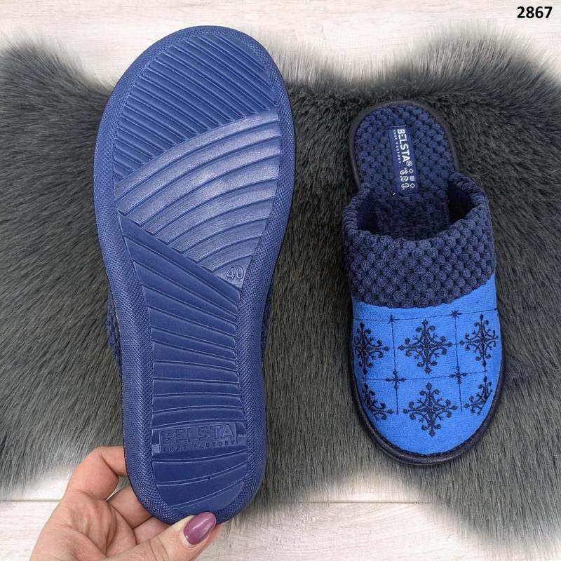 Жіночі кімнатні капці Белста із закритим носком, блакитні із синьою стьобаною устілкою і красивим вишитим візерунком.
