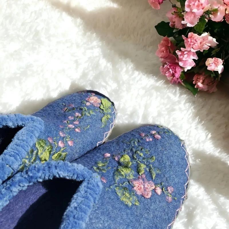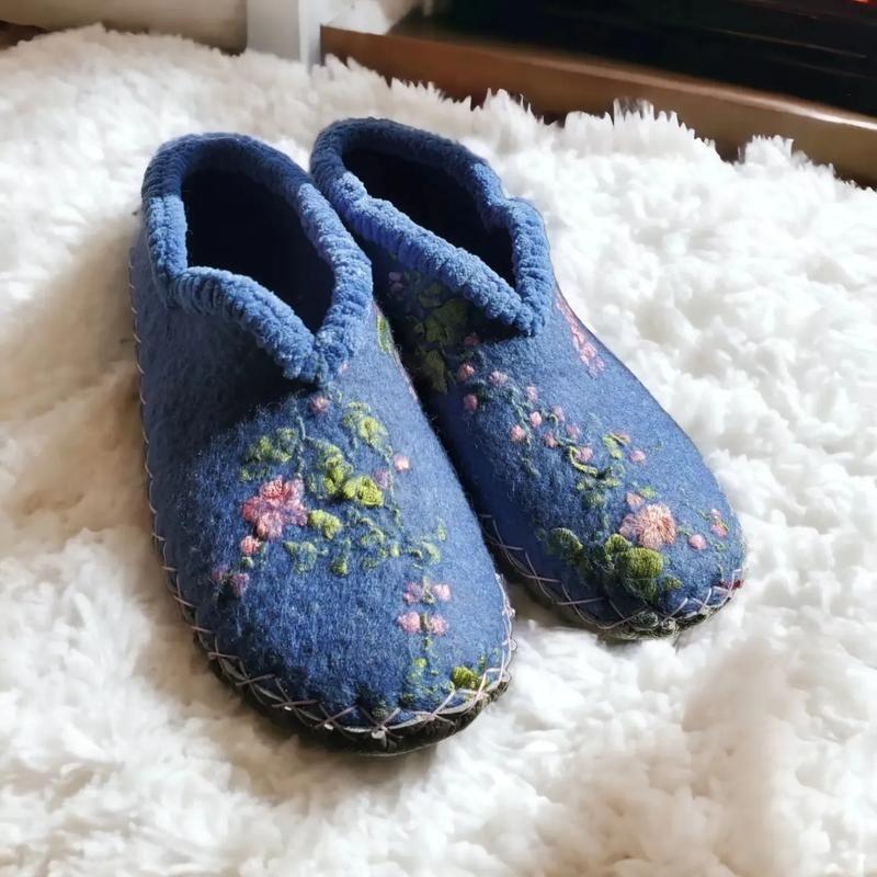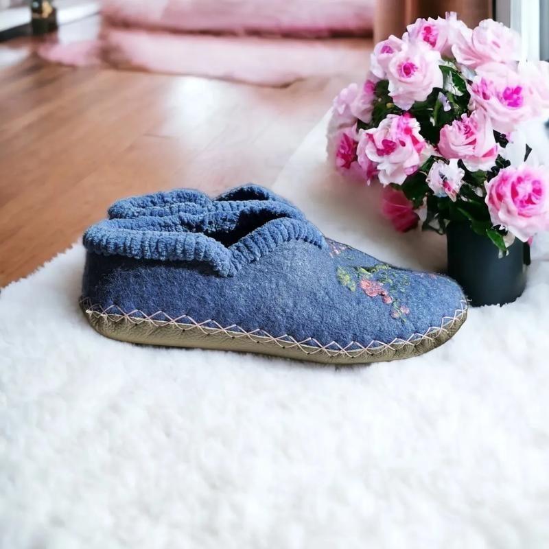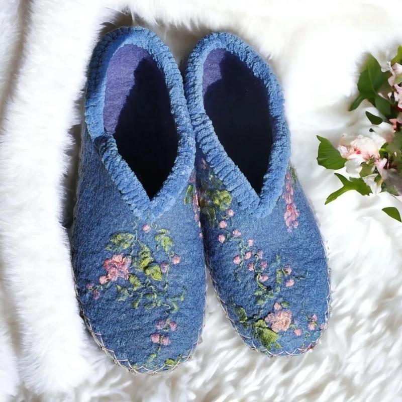 Женские войлочные тапочки изготовлены вручную из 100% овечьей шерсти. Подошва - натуральная кожа, мягкая, ноская, не скользит. Техника нуно фелтинг.Тапки формуются на профессиональных обувных колодках, поэтому имеют устойчивую форму и очень комфортно сидят на ножке. Для изготовления (в зависимости от сложности заказа) требуется от 7 - 10 дней.Тапочки из шерсти подходят для любого сезона, как летом, так и зимой, ножка в них не потеет и не мёрзнет. Информацию о лечебных свойствах войлока и уход за войлочной обувью прилагаю в мини-книжечке "Инструкция по уходу за войлочной обувью". И всё таки, очень кратко, хочу сказать, что войлок осуществляет лечение: