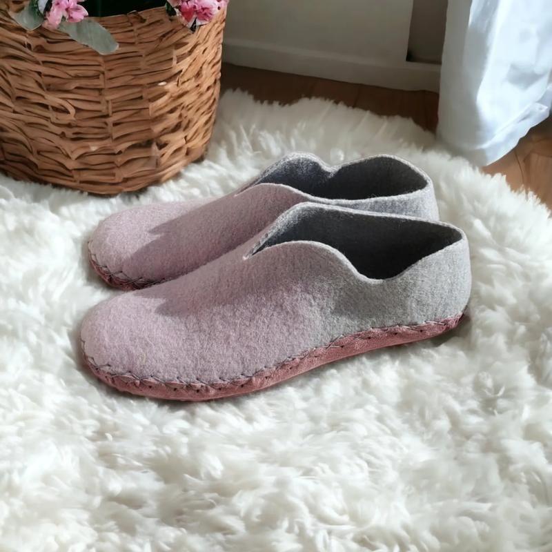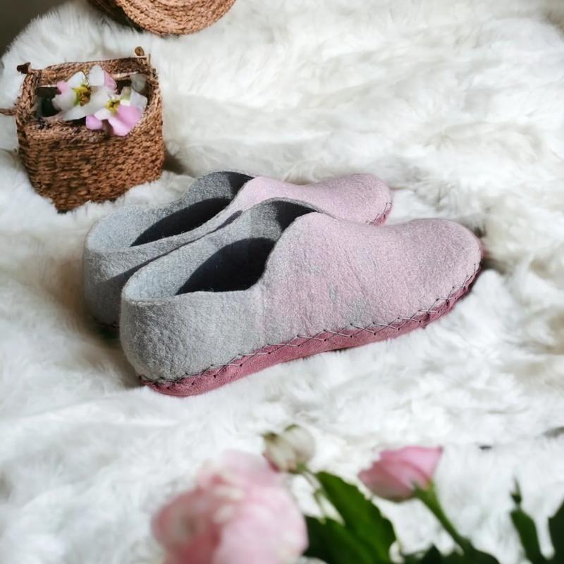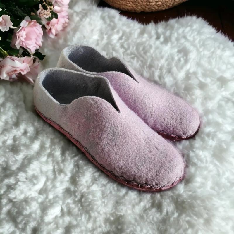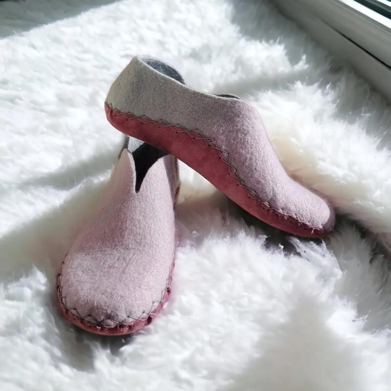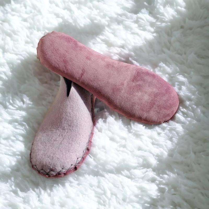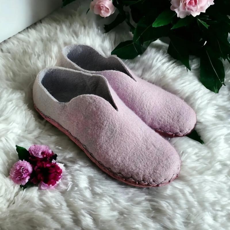Женские войлочные тапочки изготовлены вручную из 100% мериноса. Супер тонкие, мягчайшие, тёпленькие. Прекрасные для сна, по типу носочков, только подшиты тонким натуральным замшем. Подошва - натуральная кожа, мягкая, ноская, не скользит. Тапки формуются на профессиональных обувных колодках, поэтому имеют устойчивую форму и очень комфортно сидят на ножке. Для изготовления (в зависимости от сложности заказа) требуется от 7 - 10 дней.Тапочки из шерсти подходят для любого сезона, как летом, так и зимой, ножка в них не потеет и не мёрзнет. Информацию о лечебных свойствах войлока и уход за войлочной обувью прилагаю в мини-книжечке "Инструкция по уходу за войлочной обувью". И всё таки, очень кратко, хочу сказать, что войлок осуществляет лечение: