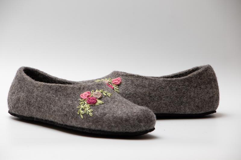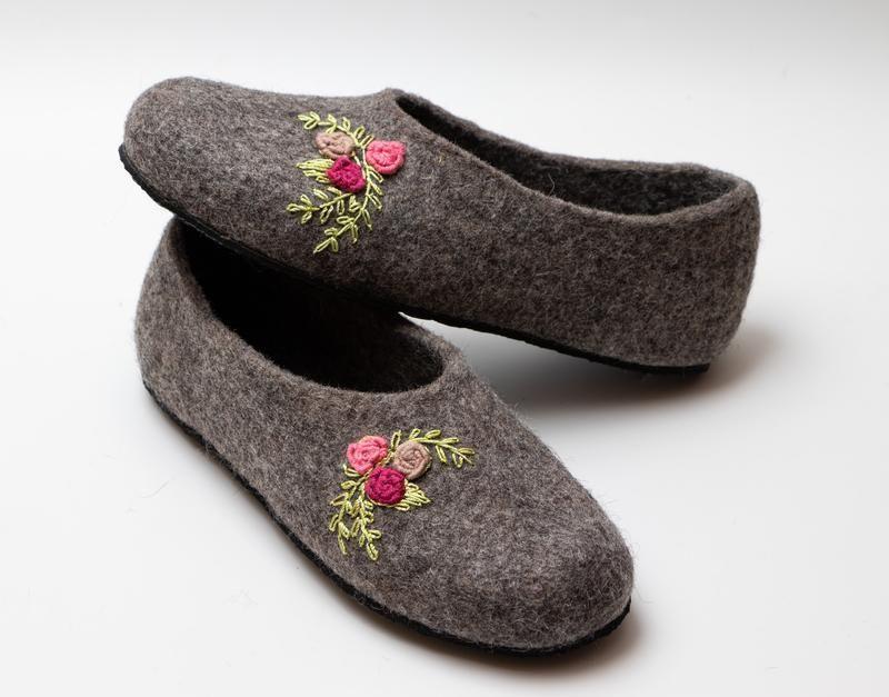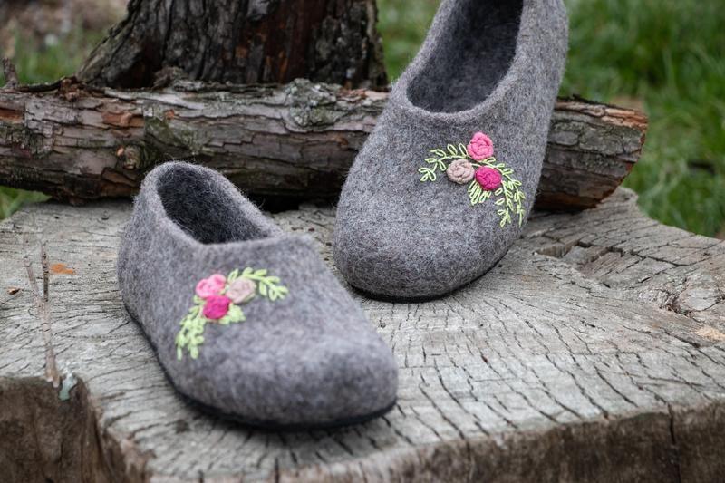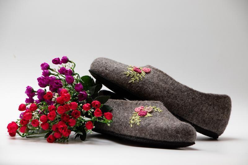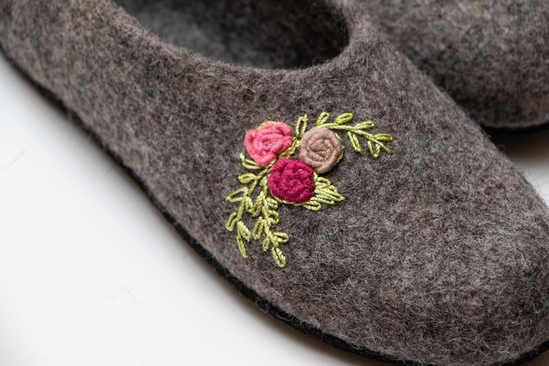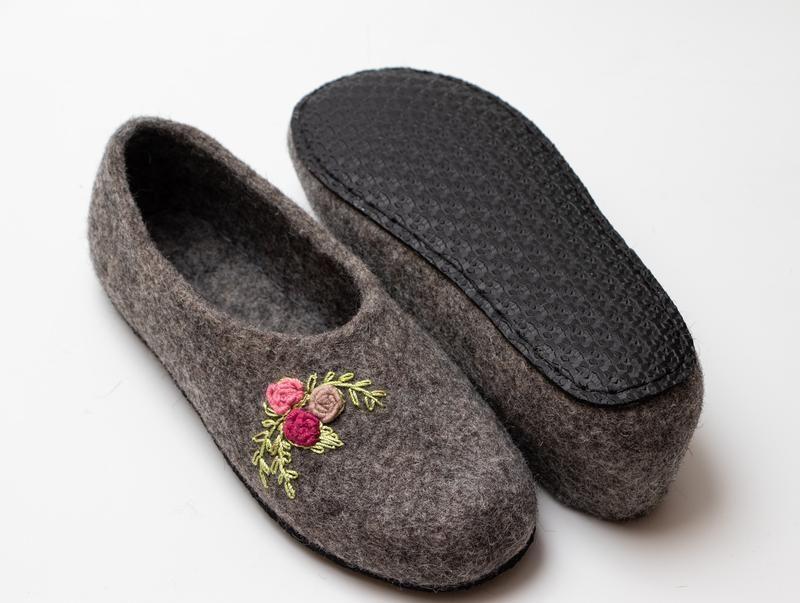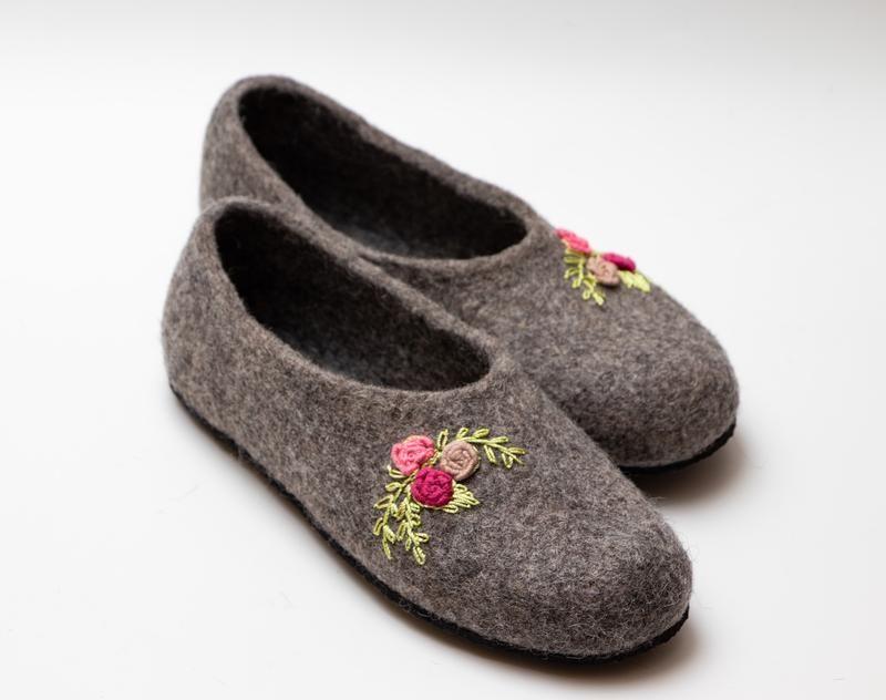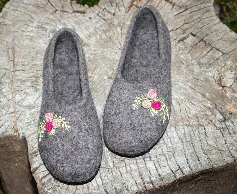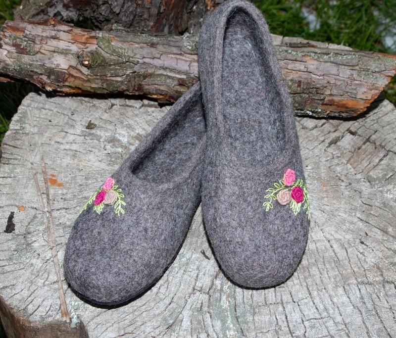 Жіночі домашні повстяні тапочки сваляны з 100% високоякісної натуральної новозеландської вовни. Ручна робота.Авторський дизайн.Ручна вишивка квітів троянд Підошва підшита микропорой ((((((чи натуральна шкіра за Вашим вибором. Жіночі домашні повстяні тапочки м'які,теплі, зручні. В них не жарко влітку і не холодно взимку. Повстяні тапочки володіють лікувальним ефектом, як будь-яка повстяна взуття. Натуральна овеча вовна поглинає і випаровує вологу, залишаючись при цьому сухою. Сухе тепло допомагає при простудних і запальних захворюваннях. Шість не вбирає запахи, прекрасно пропускає повітря, що перешкоджає розвитку грибкових захворювань.Ваші ноги дихають, завжди в теплі і ніколи не потіють. Взуті на босі ноги повстяні тапочки надають масажну дію, що сприяє поліпшенню мікроциркуляції крові,знімається загальне напруження, втома і важкість у ногах, зменшуються набряки. Жіночі домашні валяні тапочки будуть прекрасним і корисним подарунком. Подаруйте своїм ніжкам живе тепло овечої вовни.Носіть повстяні тапочки на босі ноги і будьте здорові! Приймаю замовлення на виготовлення будь-яких розмірів.Термін виготовлення 7 днів. Подивіться й інші мої роботи.