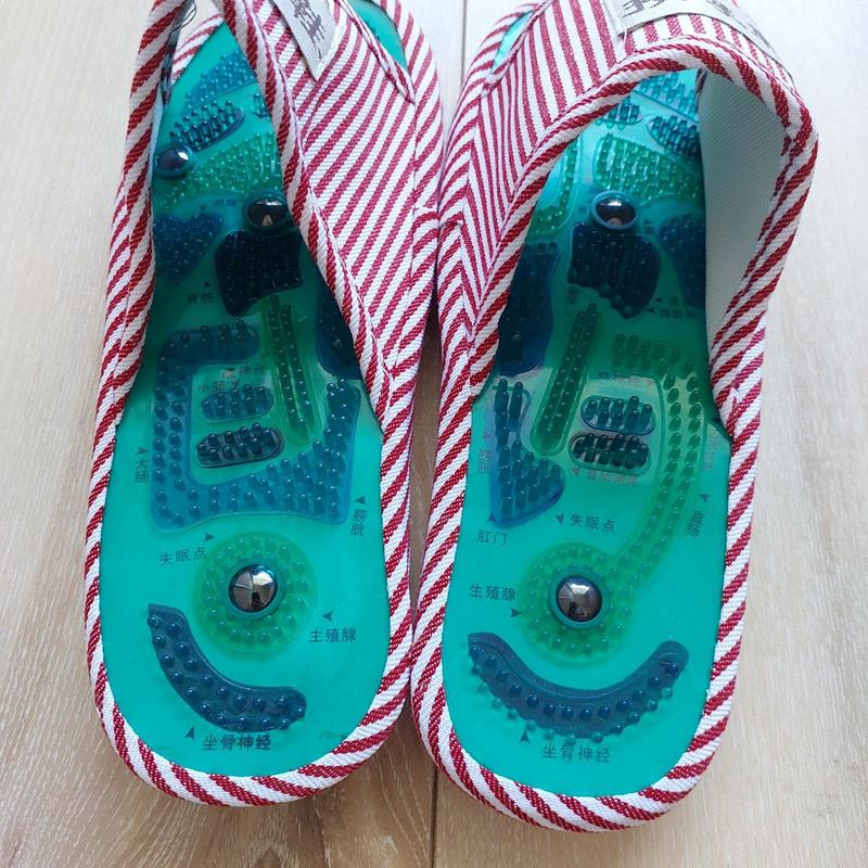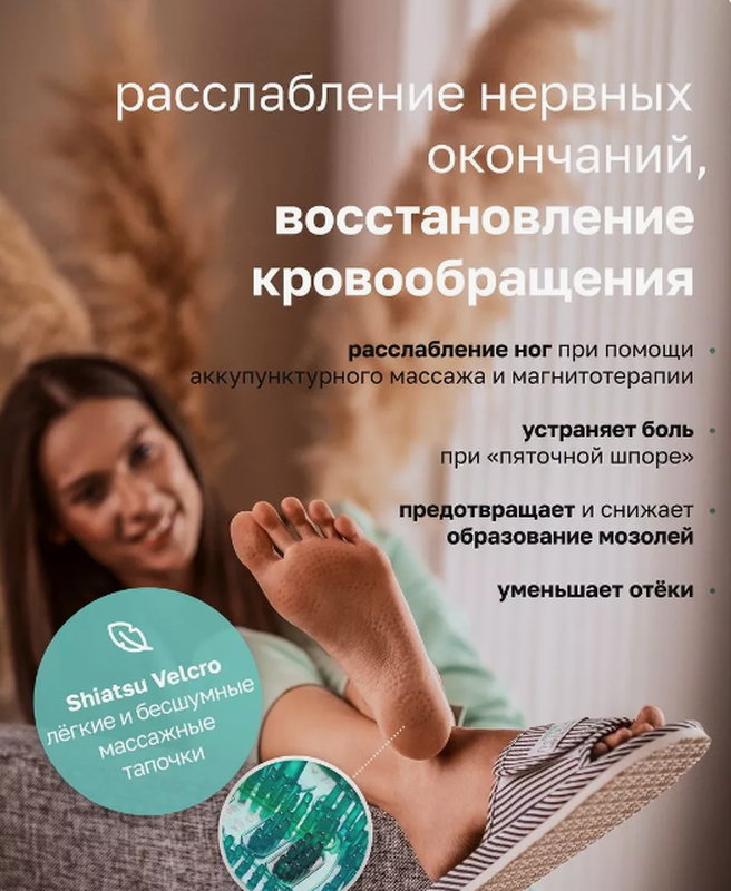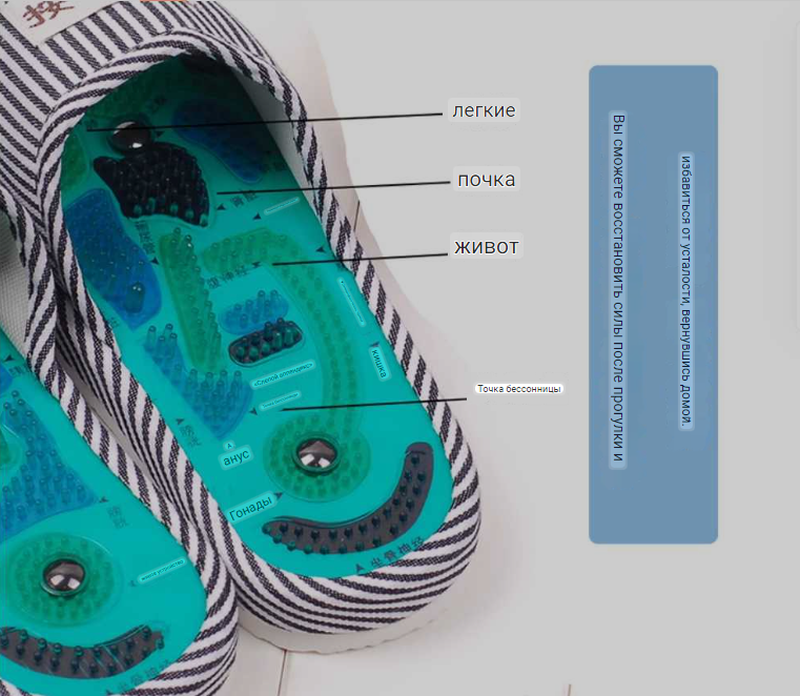 Як усі ми знаємо, стопа людини покрита безліччю біологічно активних точок, які відповідають за якийсь певний орган або систему людини. Також на підошві знаходяться три невеликі магніти. Позитивний вплив тапок під час регулярного використання підтвердили численні користувачі. Тому тапки Шіацу рекомендуються ортопедами як найбільш корисне взуття для ходьби вдома для людей пожилого возраста так и людям, котрі мають проблеми з ногами, сосудами.