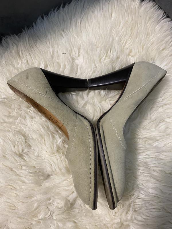 Фото На теле нет) замеры на фото)каблуки средней высоты,передки округлённые на них швы,зашевые кожаные,цвет серо-зелёный-оливковый)из нюансов-местами есть тёмные затирки на фото указано)