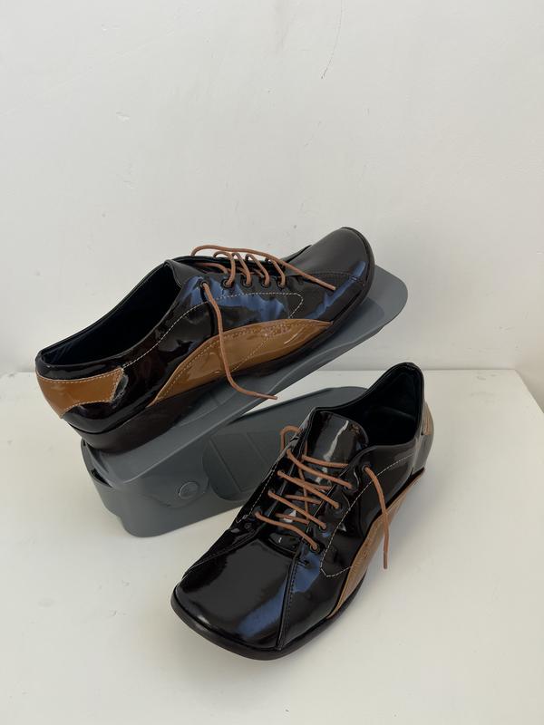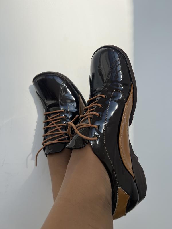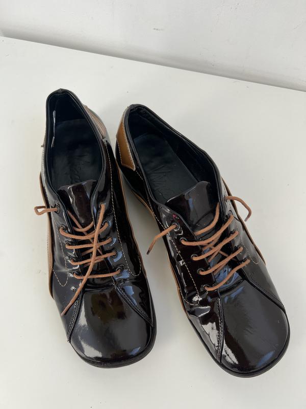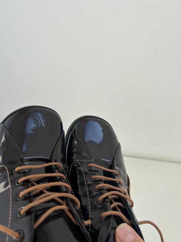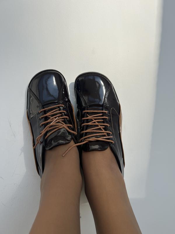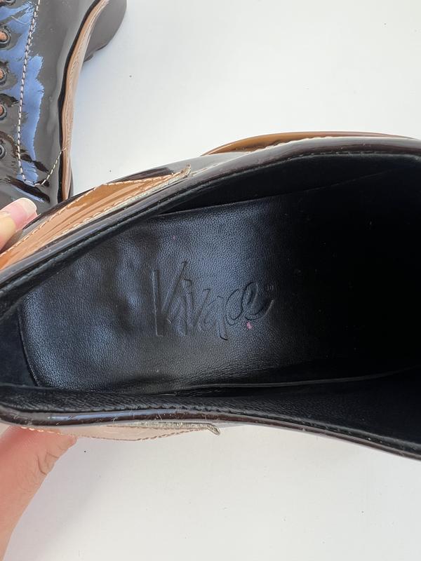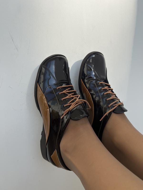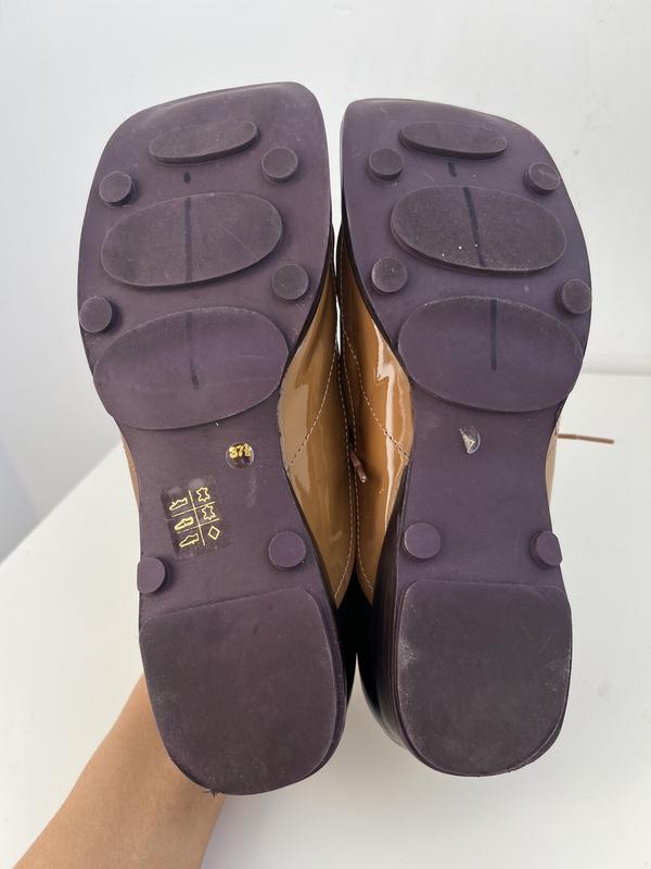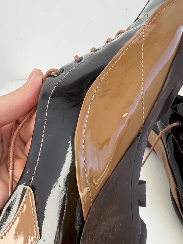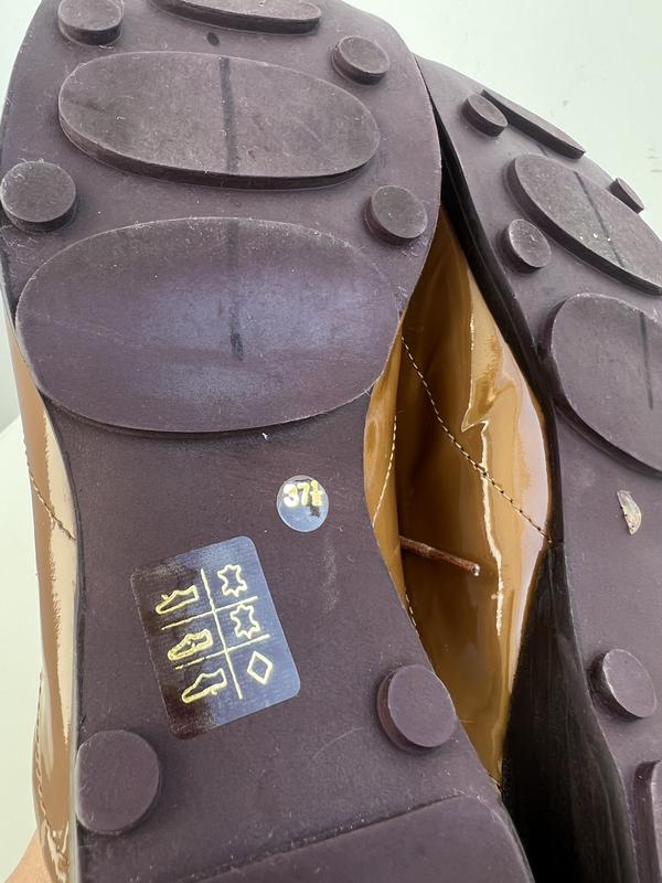 Є декілька маленьких цяточок, на фото показала, в носці не помітно. Повністю натуральна шкіра. Дуже зручні. Колір темно коричневий.